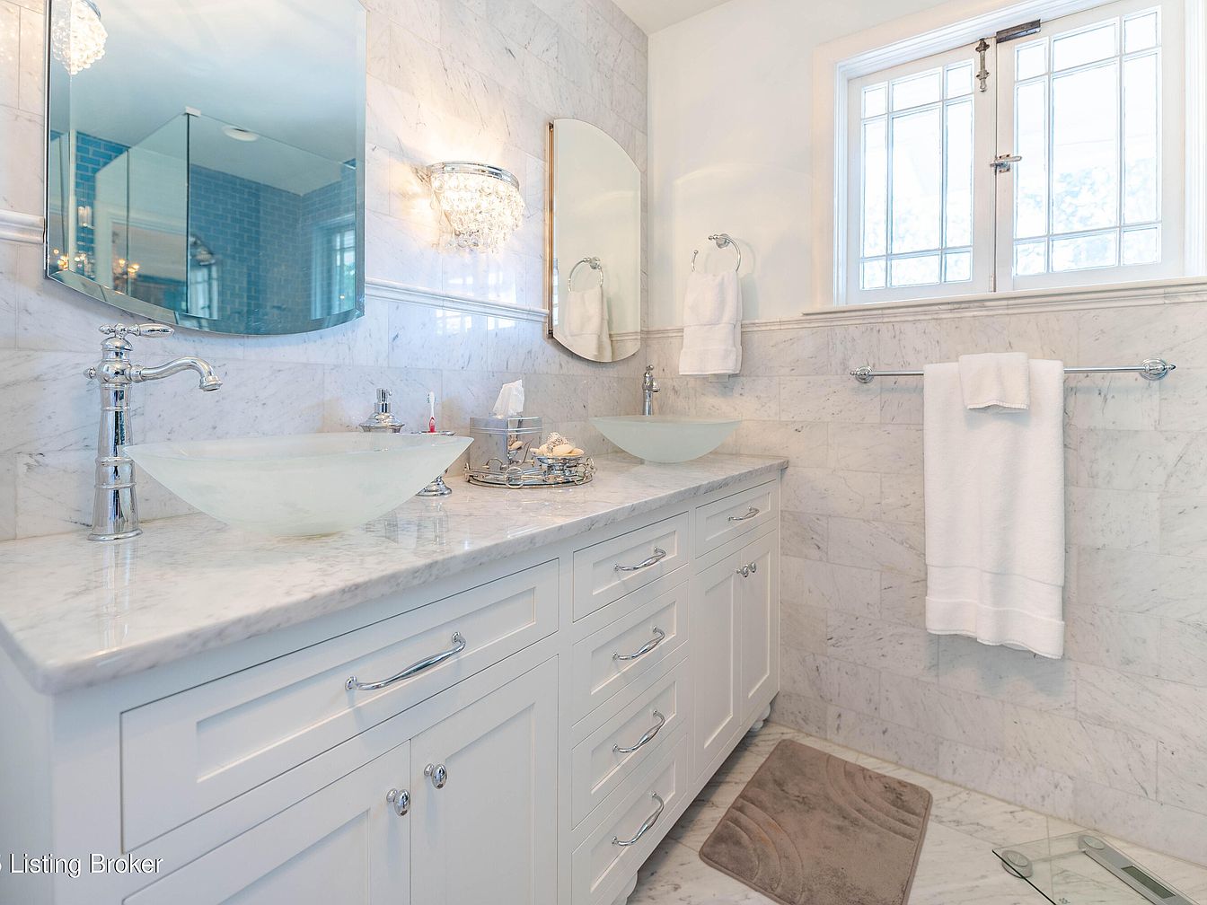 This elegant bathroom showcases a contemporary design, highlighted by a spacious double vanity adorned with a smooth marble countertop and sleek white cabinetry. Two striking vessel sinks provide a modern touch, complemented by polished chrome faucets. The subtle color scheme of soft whites and grays enhances the ambiance, while large mirrors reflect natural light, creating an airy feel. Decorative touches include crystal sconces that add a hint of glamour. Family-friendly features include ample storage and easy-to-clean surfaces. Marble tiles extend seamlessly across the floor, combining functionality with luxury, making this space a serene retreat.