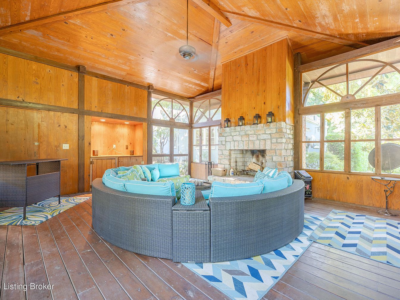 This inviting sunroom features a curved, wicker sofa adorned with vibrant teal cushions and patterned throw pillows, perfect for family gatherings. The wooden ceiling adds warmth to the space, while large windows provide ample natural light, connecting the indoors to the lush outdoor scenery. A stunning stone fireplace serves as a focal point, creating a cozy atmosphere for cooler evenings. The rich wood paneling harmonizes with the earthy tones of the wooden floor, enhancing the room’s rustic charm. Colorful area rugs add a playful touch, making this sunroom an ideal retreat for relaxation and conversation.