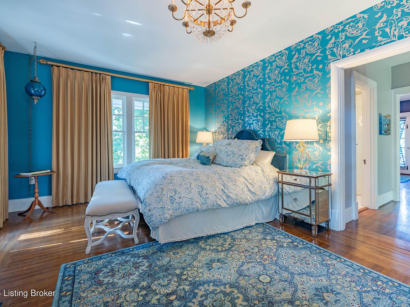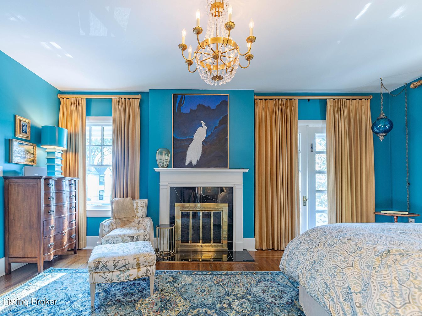 This beautifully designed master bedroom features a vibrant turquoise accent wall that injects life into the space. A plush, inviting bed with intricate bedding is centered, while a cozy chair with floral upholstery provides a perfect reading nook. Elegant drapes in a warm golden hue frame the tall windows, enhancing the room’s sunlight appeal. A striking chandelier adds a touch of sophistication, complementing the artistic flair of a large painting above the fireplace. Family-friendly touches include a soft area rug and ample natural light, creating an atmosphere that balances comfort, style, and tranquility.
