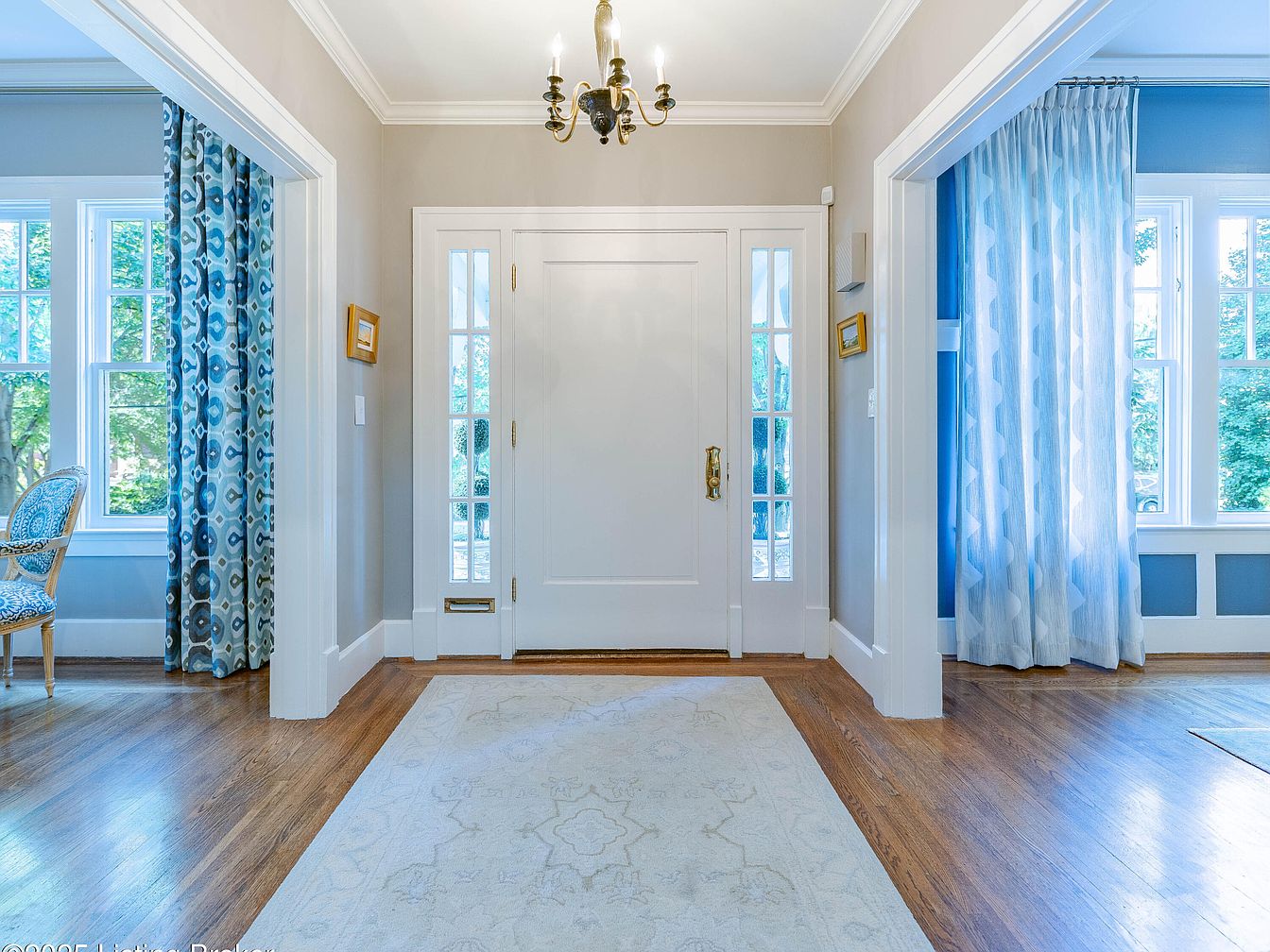 This inviting entryway features elegant architectural details, including crown molding and a classic chandelier, enhancing the home’s welcoming ambiance. The layout allows for easy flow into adjoining spaces, highlighted by natural light cascading through large windows. A tasteful color scheme of soft grays and whites complements the rich wooden flooring, creating a warm and inviting atmosphere. Decorative curtains with geometric patterns add a modern touch while providing privacy. A plush area rug anchors the space, offering comfort underfoot. A quaint seating option encourages relaxation, making it perfect for family greetings or casual conversations.