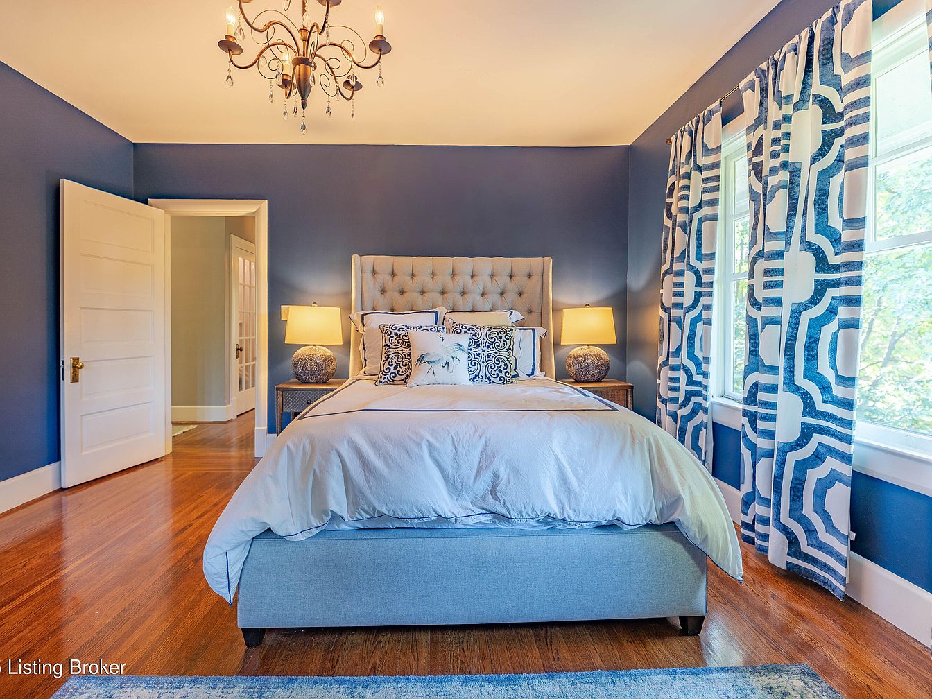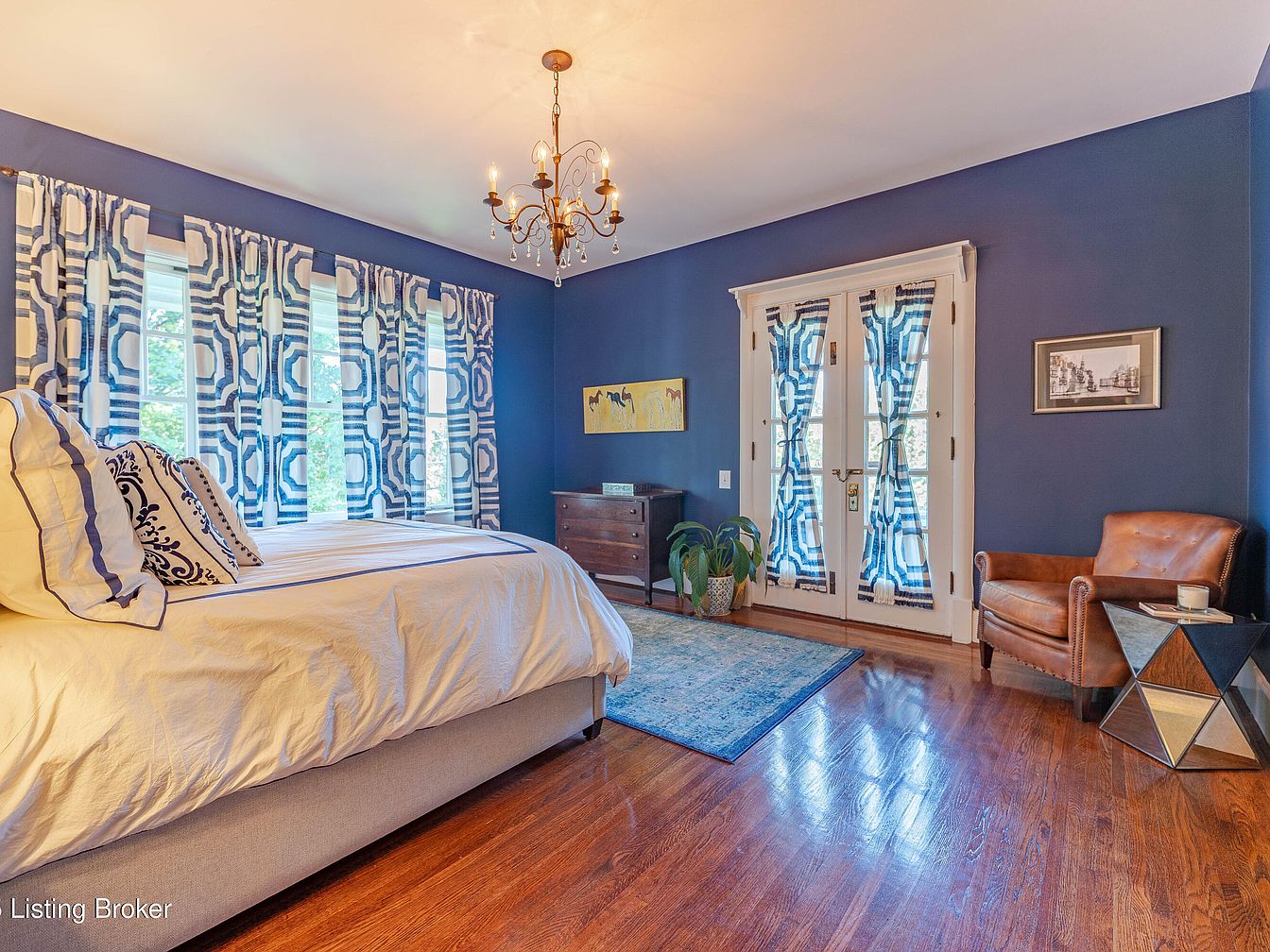 This master bedroom boasts an elegant yet cozy atmosphere, highlighted by rich navy blue walls that create a serene backdrop. A plush bed, adorned with patterned throw pillows and crisp linens, invites relaxation. Natural light filters through geometric-patterned curtains, framing a lovely view outside. The space features a sophisticated chandelier that adds a touch of glamour, while warm hardwood floors add character and warmth. A stylish leather armchair offers a perfect reading nook beside a chic side table. Thoughtfully positioned interior doors lead to outdoor spaces, ensuring a seamless blend of indoor comfort and outdoor tranquility.
