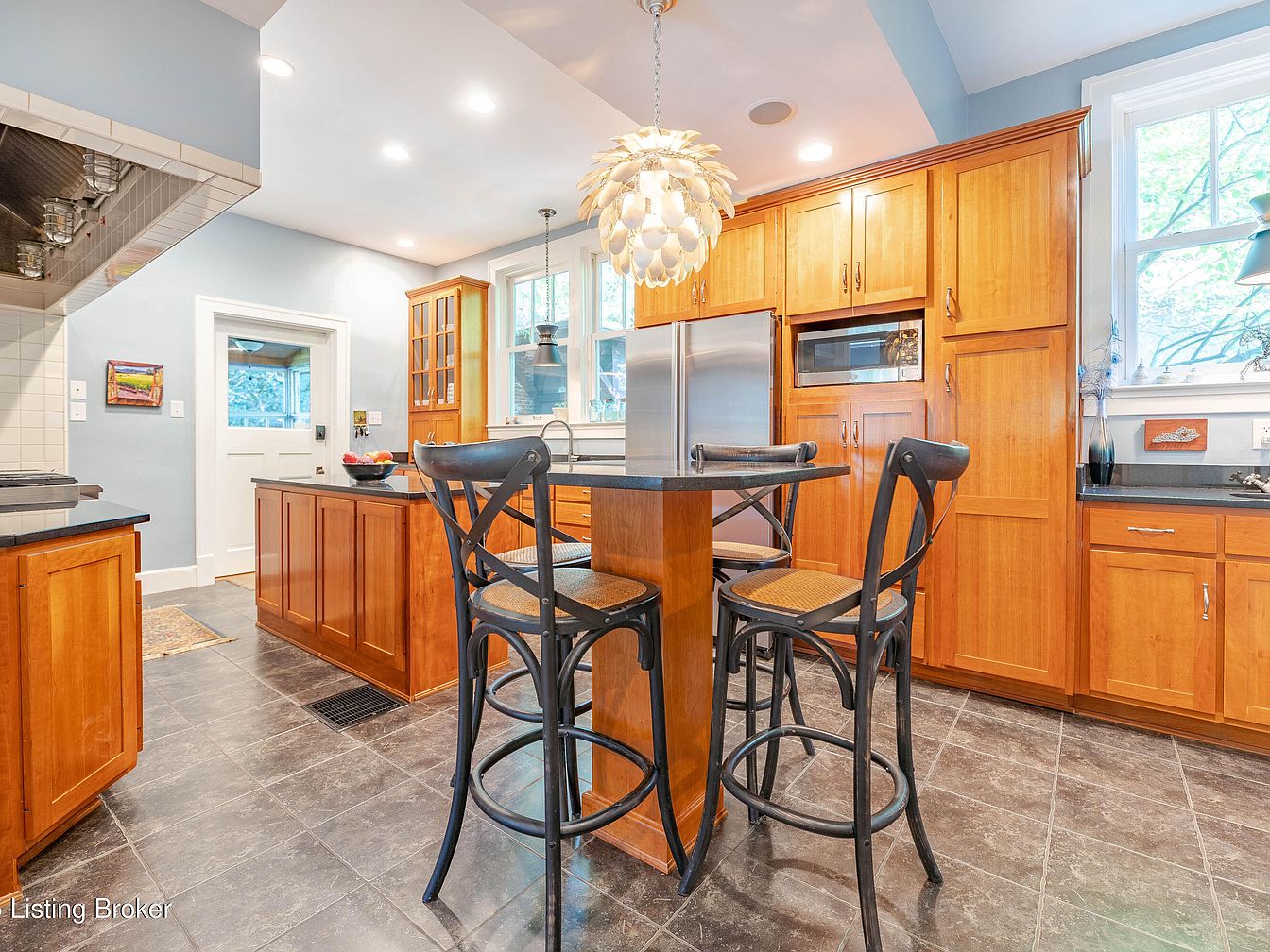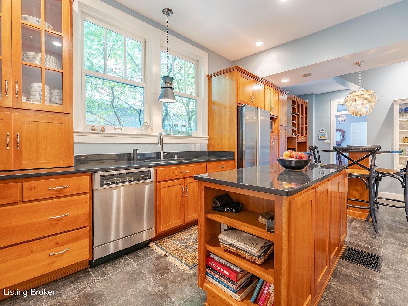 This modern kitchen seamlessly blends functionality with style, featuring warm wood cabinetry and sleek black granite countertops. The thoughtful layout provides ample storage, including glass-front cabinets showcasing elegant dishware. Sunlight floods in through generous windows, creating a bright and inviting atmosphere. The central island doubles as a workspace and gathering spot, complete with a charming bowl of fresh fruit. Contemporary lighting enhances the aesthetic, while the gray tiled floor adds durability and ease of maintenance. Family-friendly elements include an open design, ideal for entertaining, and nearby dining areas, making it the perfect hub for culinary creations and cozy gatherings.
