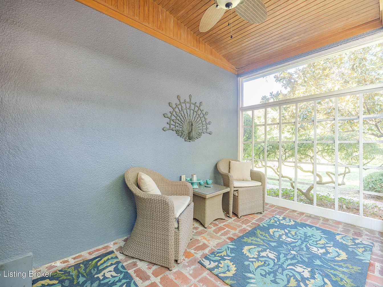 This sunroom offers a serene escape with its expansive glass windows that frame a lush garden view. Featuring a charming brick floor and warm wooden ceiling, the space blends indoor comfort with nature. The elegant floral area rug adds a touch of color, enhancing the inviting atmosphere. Stylish wicker chairs provide plenty of seating, while the brick accent wall hints at rustic charm. The open layout allows natural light to fill the room, promoting relaxation and family gatherings. Ideal for morning coffee or evening chats, this sunroom is a perfect family-friendly retreat intertwined with the home’s outdoor beauty.