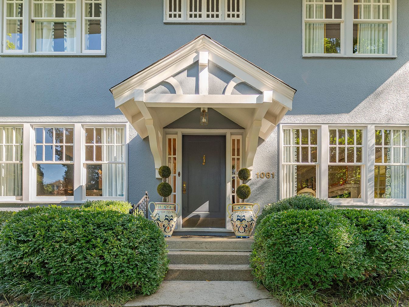 The entryway exudes charm with its inviting gabled overhang and well-defined architectural lines. A bold dark front door contrasts beautifully with the soft blue-gray exterior, complemented by white trim and large, multi-paned windows that enhance natural light. The manicured hedges create a sense of serenity, while colorful ceramic planters add a vibrant touch. Two round topiaries flank the entrance, promoting a welcoming, family-friendly atmosphere. The overall aesthetic is a harmonious blend of classic and contemporary, perfect for creating an inviting first impression while ensuring practicality and comfort for everyday family life.