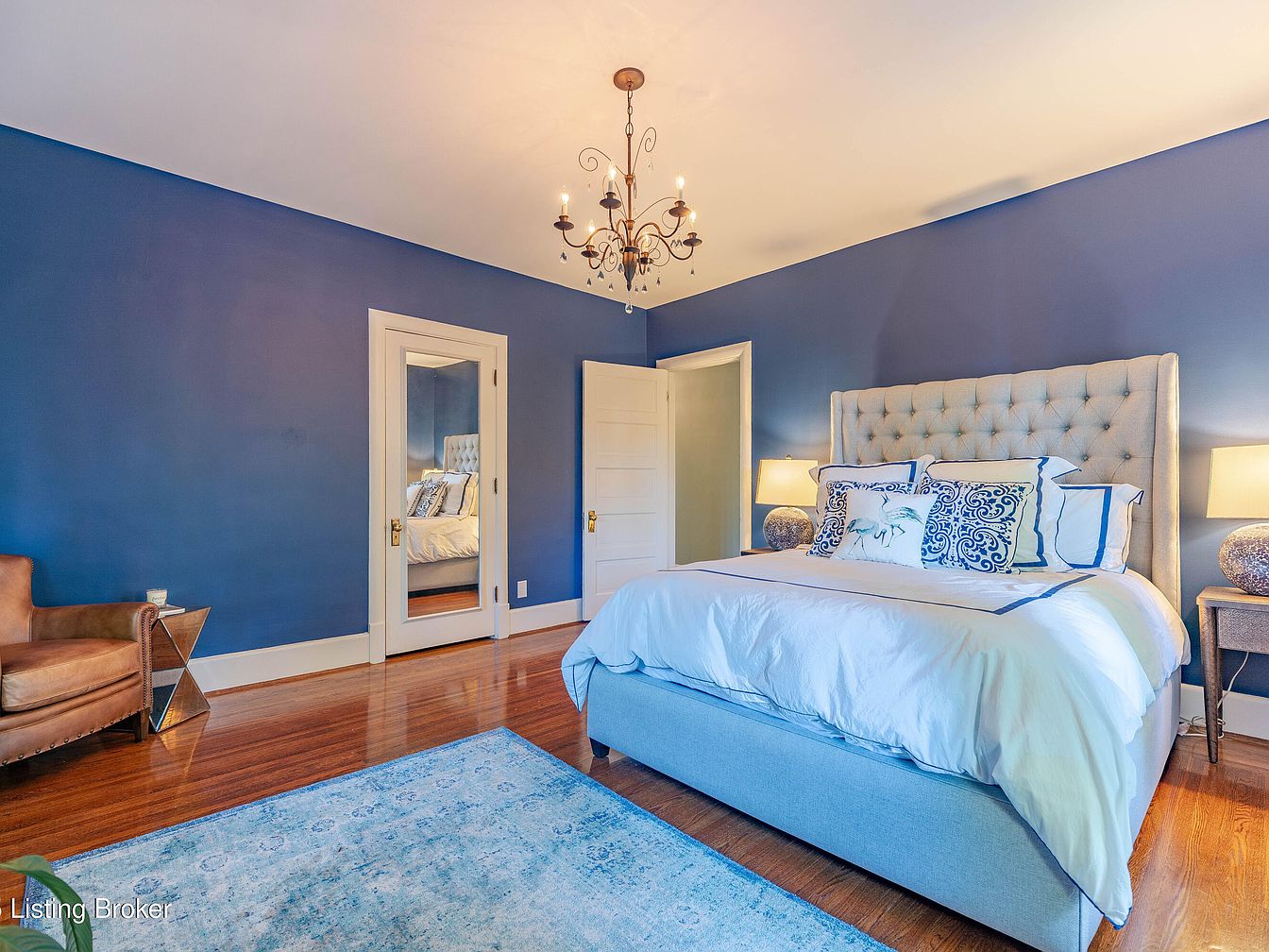 This master bedroom exudes elegance with its rich navy blue accent wall, offering a calming yet sophisticated ambiance. The plush, upholstered king-size bed features a tufted headboard adorned with decorative pillows, creating a cozy focal point. Natural wooden floors bring warmth, complemented by a stylish area rug that adds a touch of softness underfoot. An inviting leather chair invites relaxation, while chic side lamps on coordinating nightstands provide warm lighting. Architectural details like crown molding and a delicately designed chandelier enhance the room’s charm, making it a perfect sanctuary for restful nights in a family-friendly home.
