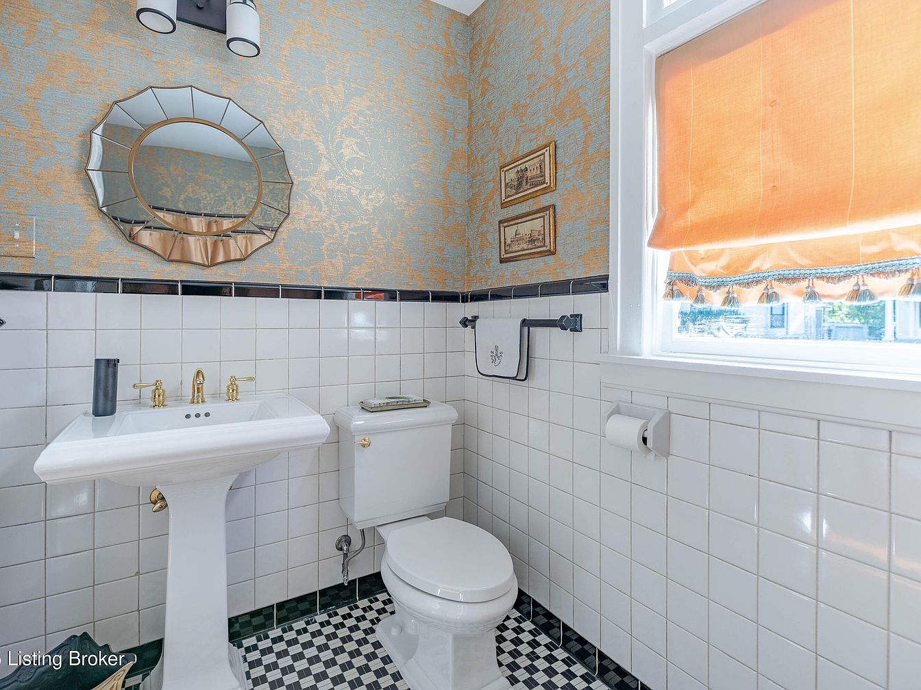 This sophisticated bathroom features a blend of classic and modern elements, highlighted by decorative wallpaper in soft blue and gold tones. The elegant white pedestal sink and matching toilet contribute to a timeless aesthetic. A round, sunburst mirror adds a striking focal point, enhancing the space’s brightness. The black and white tiled floor provides a chic contrast, while the orange fabric window treatment introduces a pop of color, ensuring a vibrant yet cozy atmosphere. Small framed artworks add character, making this bathroom not just functional but a stylish retreat for family and guests.