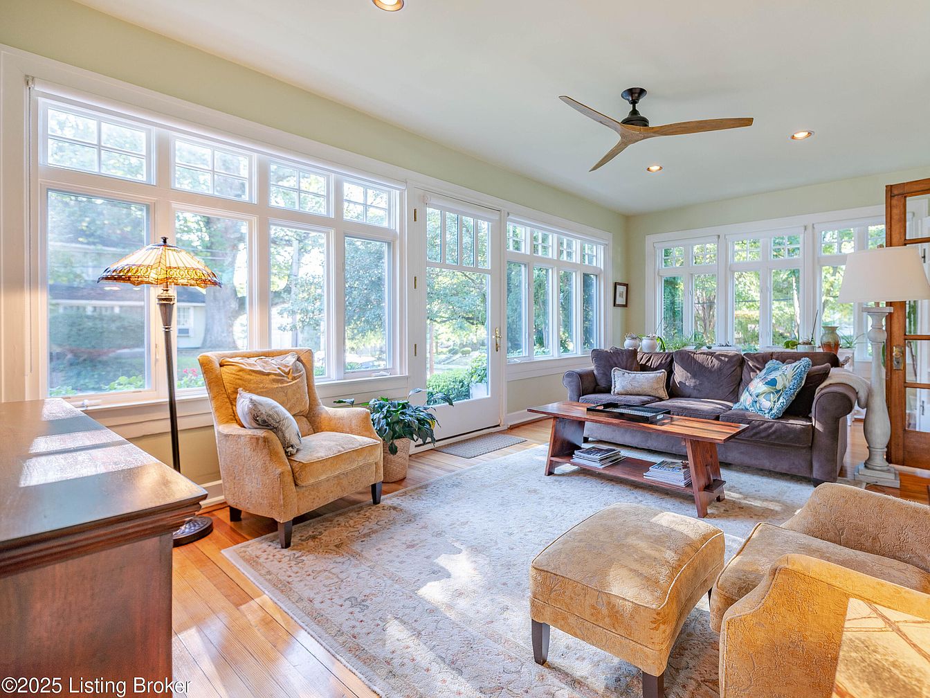This sunroom is a serene haven, featuring large windows that flood the space with natural light and offer views of the lush landscape outside. The light color palette of soft greens and warm beige creates an inviting atmosphere. Comfortable seating includes plush armchairs and a cozy sofa, adorned with decorative cushions in fresh blues. A wooden coffee table serves both style and function, while a tasteful area rug adds texture to the hardwood floor. Family-friendly elements include ample space for relaxation and socializing, as well as easy access to the outdoors, making it an ideal gathering spot.