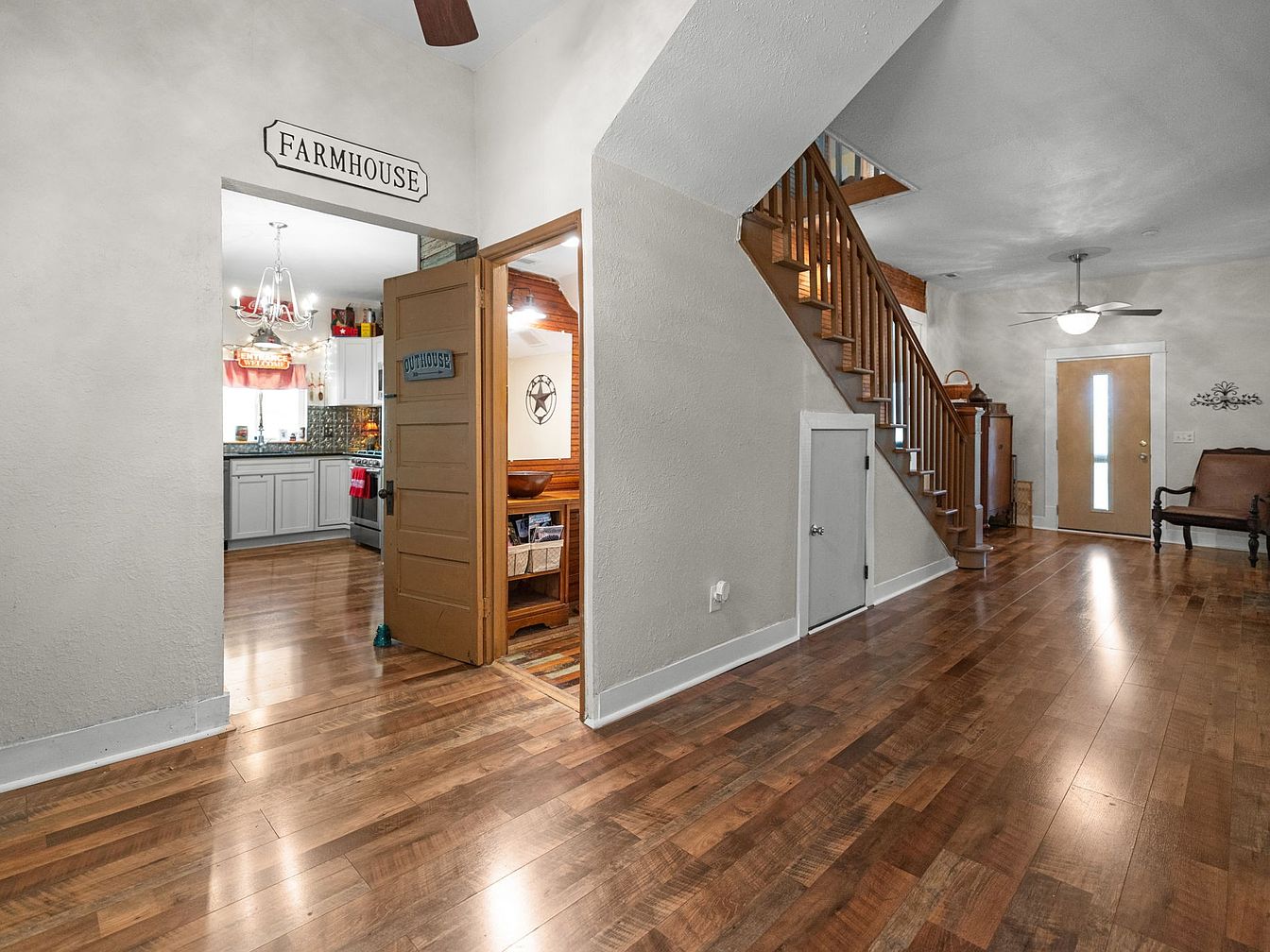 A spacious and inviting entryway showcases warm wood floors and neutral-toned walls, setting a welcoming tone for the home. The open layout seamlessly connects to the kitchen, visible through a wide doorway with a charming farmhouse sign. Solid hardwood stairs with classic wooden railings add architectural interest and lead to the upper level, complemented by a small storage closet beneath. This area features plenty of natural light, a ceiling fan to keep the space comfortable, and bench seating ideal for families. The overall design is practical and family-friendly, with durable finishes and functional organization.