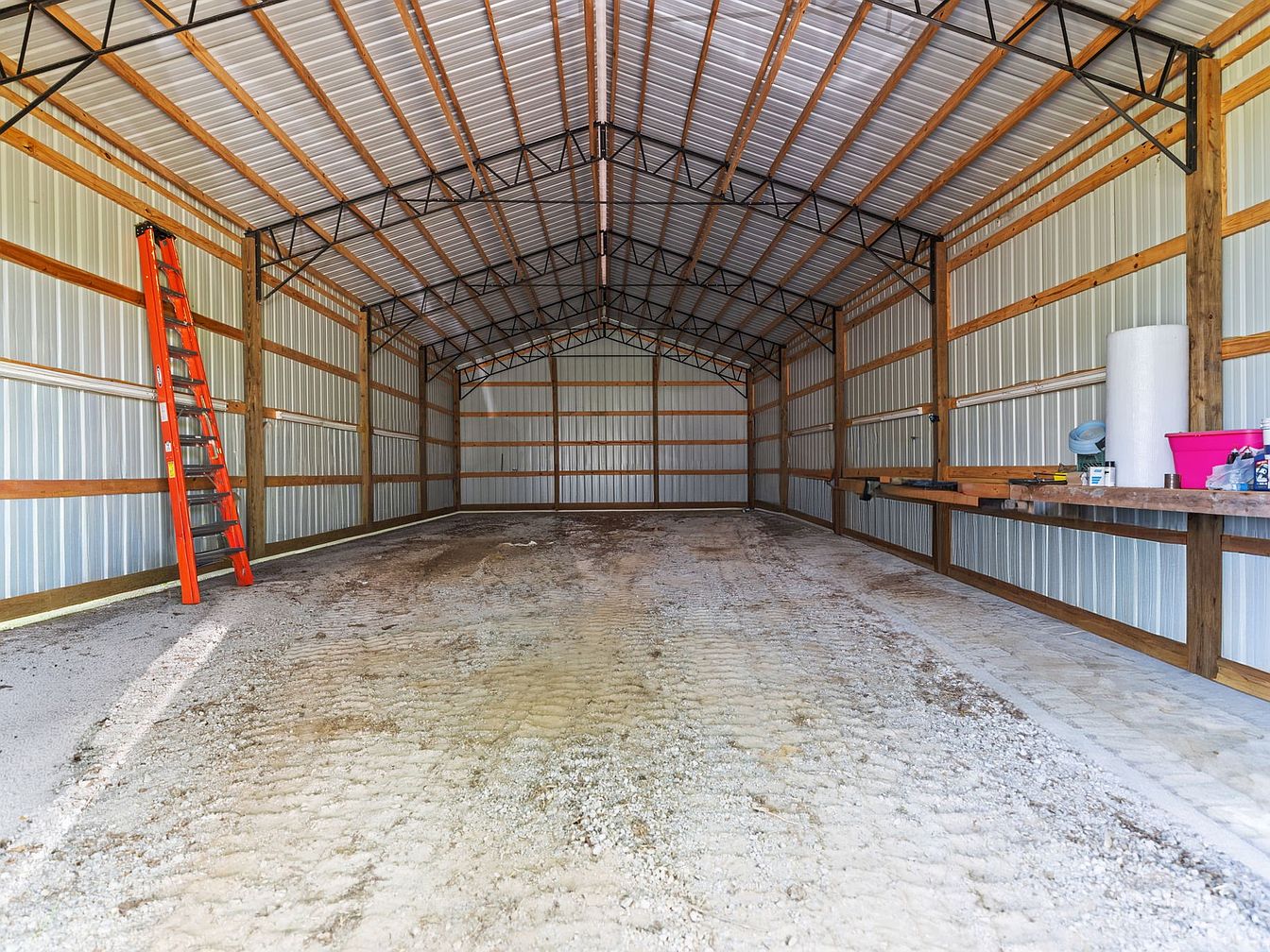 Spacious and practical, this garage workshop features high, vaulted metal ceilings with exposed wooden beams and sturdy steel supports, creating an industrial yet inviting vibe. The expansive layout offers ample room for multiple vehicles, tools, or projects, making it ideal for family activities or storage needs. The concrete and gravel floor is easy to maintain and built for durability. One wall boasts a lengthy wooden workbench, perfect for crafts, hobbies, or home improvement tasks. Subtle metallic tones, complemented by natural wood framing, infuse the space with warmth and utility, while the orange ladder adds a pop of color and easy access to elevated tasks.