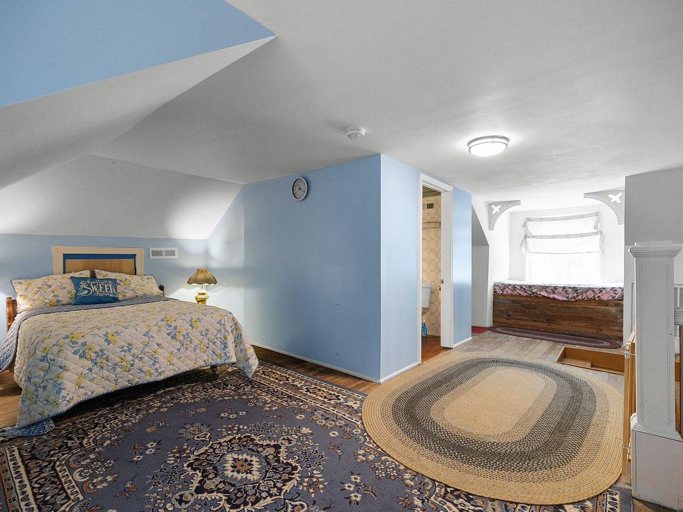 A cozy bedroom tucked under sloped ceilings, highlighted by soft pastel blue walls and abundant natural light. The queen bed features a charming floral quilt and a decorative pillow that invites relaxation, while the elegant area rug adds warmth and character. Perfect for families, the corner features a built-in window seat with wooden detailing, ideal for reading or extra seating for kids. Hardwoods run throughout, seamlessly connecting to a small, accessible bathroom. The layout maximizes usable space, while the traditional furnishings and delicate accents create a welcoming, serene retreat with thoughtful touches for comfort and family living.