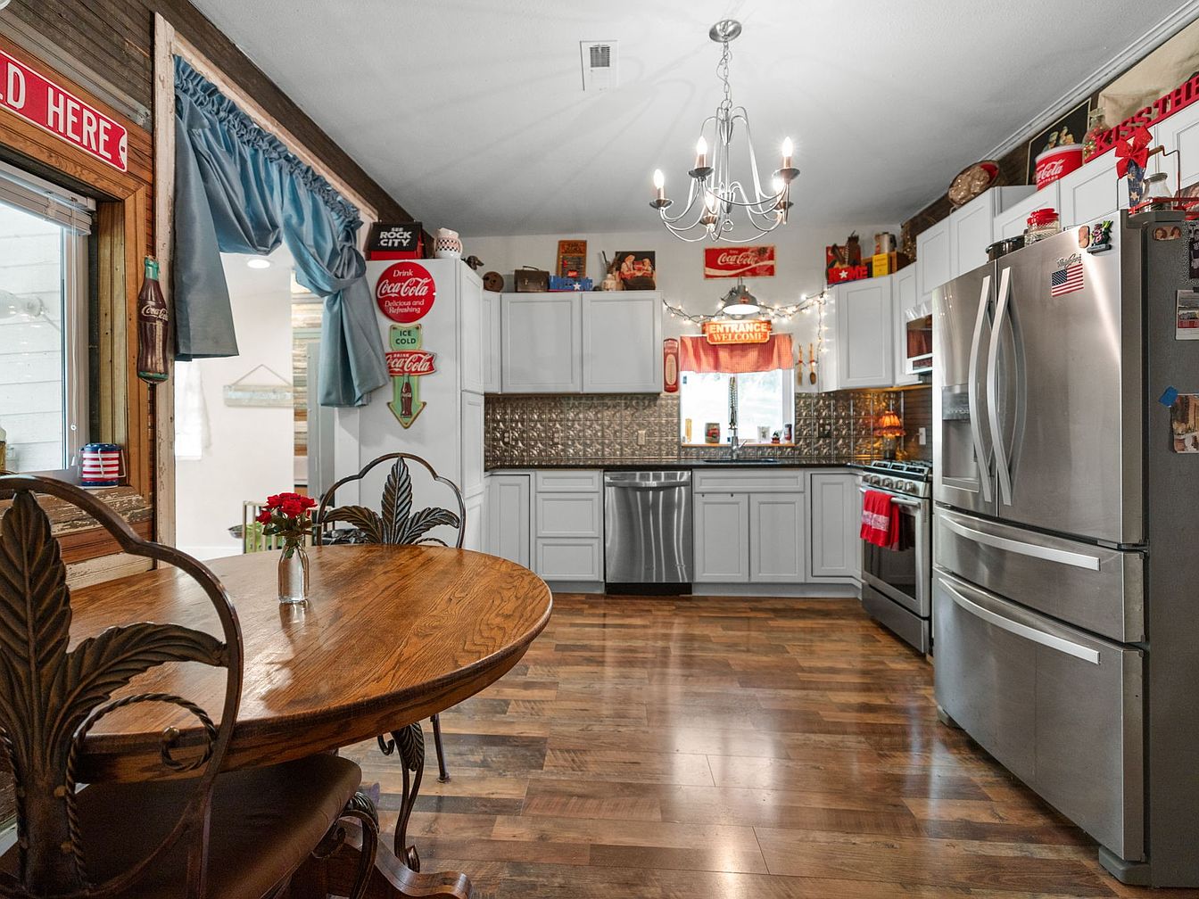 This welcoming kitchen and dining area blends vintage Americana charm with modern convenience. The space features warm wooden floors, white cabinetry, and stainless steel appliances, offering a functional layout ideal for family meals and gatherings. A round wooden dining table with ornate metal chairs anchors the dining space, topped with a small vase of fresh flowers for a homely touch. Playful retro Coca-Cola signs and red accents add a lively pop of color. The window, dressed with soft blue curtains, lets in natural light, making it inviting for children and adults alike. The open design ensures easy movement for families.
