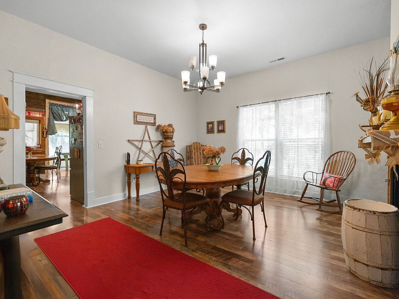 This inviting dining room blends traditional warmth with rustic charm, perfect for family meals and entertaining guests. The space features rich wooden flooring and an elegant round dining table paired with intricately designed chairs, creating a cozy atmosphere. Natural light streams through sheer white curtains on large windows, brightening the neutral-toned walls. Thoughtful decorative touches, including a unique star wall accent, dried floral arrangements, and a vintage rocking chair with a patterned cushion, enhance the homey feel. Family photos, a sturdy sideboard, and a bold red area rug add both comfort and character, making the room welcoming for gatherings of all ages.