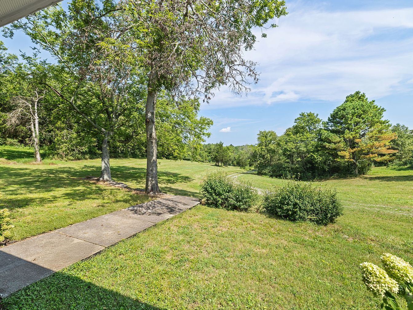 A spacious backyard offers a serene escape with a lush, gently rolling lawn dotted by mature trees and well-tended shrubbery. A wide concrete walkway leads from the house, perfect for children’s play, bike rides, or casual strolls. The open landscape ensures plenty of room for outdoor gatherings and safe play areas. Natural beauty is enhanced by soft green hues that blend with the wooded horizon, creating a peaceful, family-friendly environment. This outdoor setting is ideal for barbecues, gardening, or simply relaxing with a view of clear blue skies and spacious grassy fields.