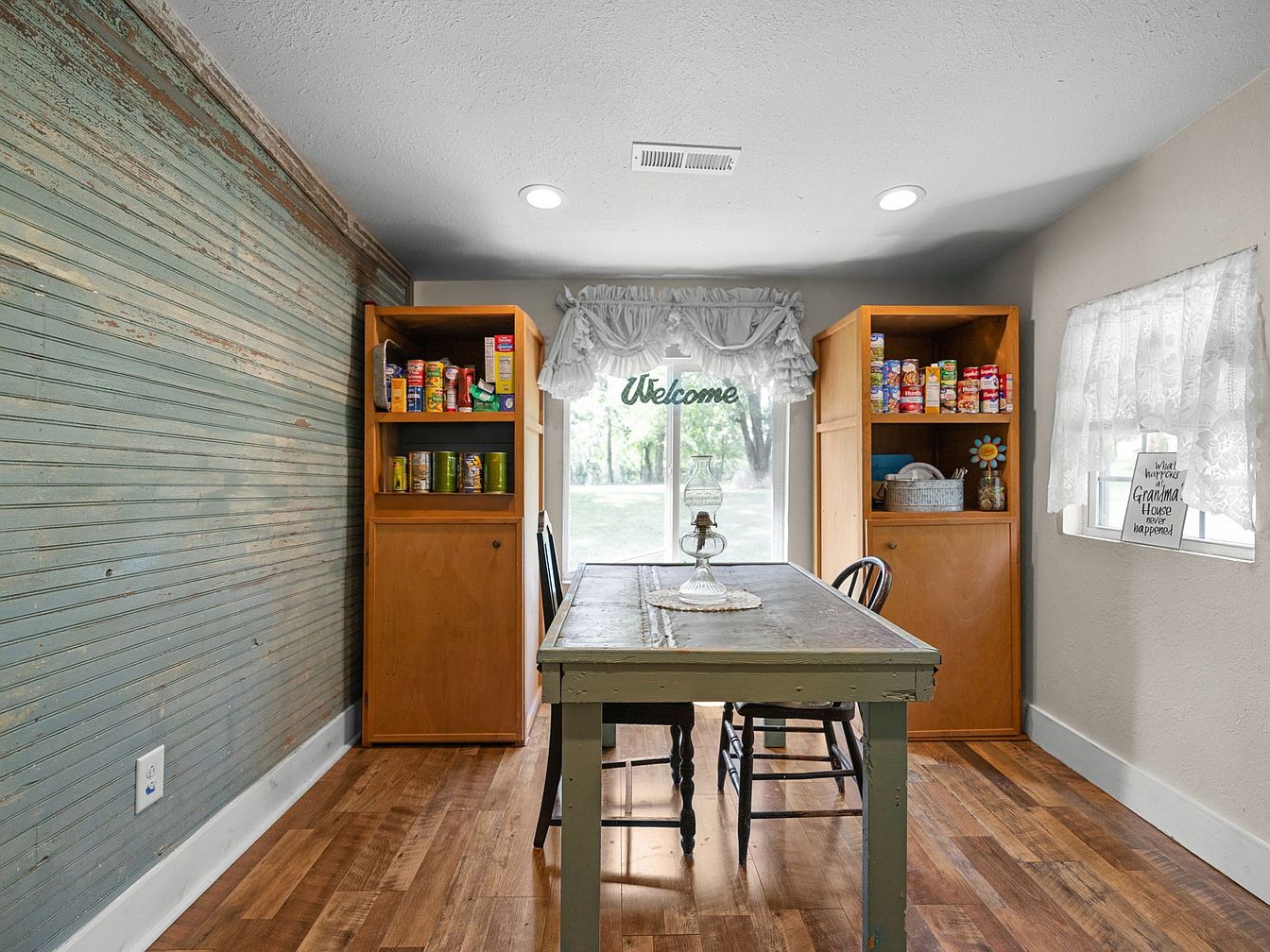 This cozy dining nook combines nostalgic charm and functional design with its weathered wooden accent wall and spacious, light-filled layout. Featuring a sturdy farmhouse table at the center, the space is flanked by two wooden pantries ideal for family meal storage, each stocked with everyday essentials. Warm hardwood floors provide a welcoming base, while lace curtains and a cheerful ‘Welcome’ sign add to the inviting atmosphere. The window allows natural light to pour in, creating a bright and homey setting perfect for shared family meals or casual gatherings. Soft, neutral walls complement the room’s rustic, lived-in feel.
