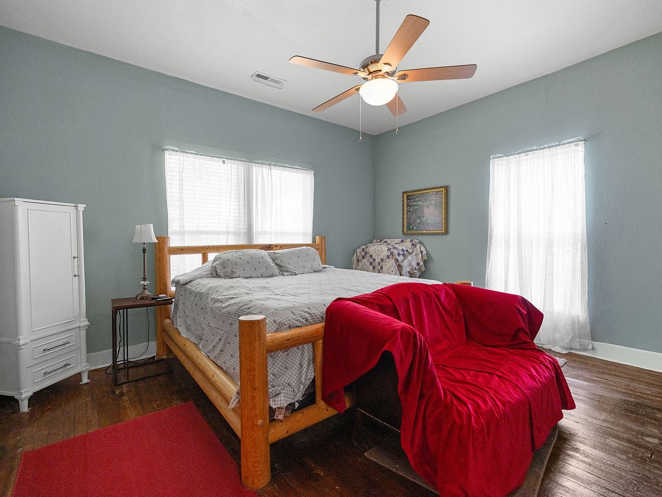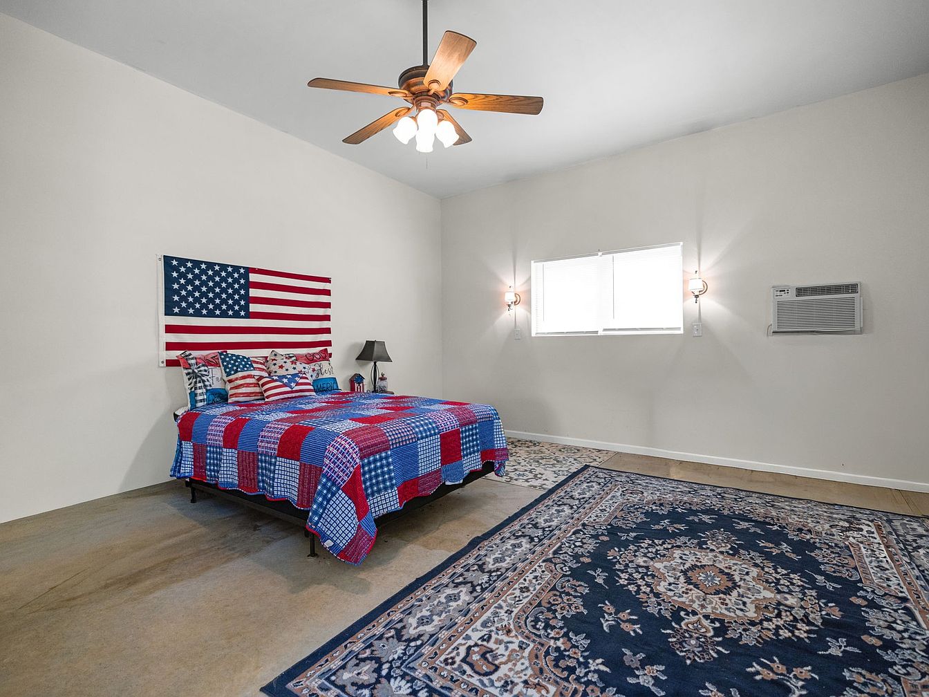 A spacious bedroom features a patriotic theme, with a large American flag displayed above the bed and bedding in matching red, white, and blue patchwork patterns. The room’s minimalist layout offers plenty of open floor space, making it ideal for families who value flexibility and play areas for children. Neutral-toned walls create a calm backdrop, while two large, intricately patterned rugs add warmth and comfort underfoot. The ceiling fan and window-mounted air conditioner provide comfort year-round. Softly glowing wall sconces and natural light from the window enhance the inviting ambiance of this family-friendly retreat.