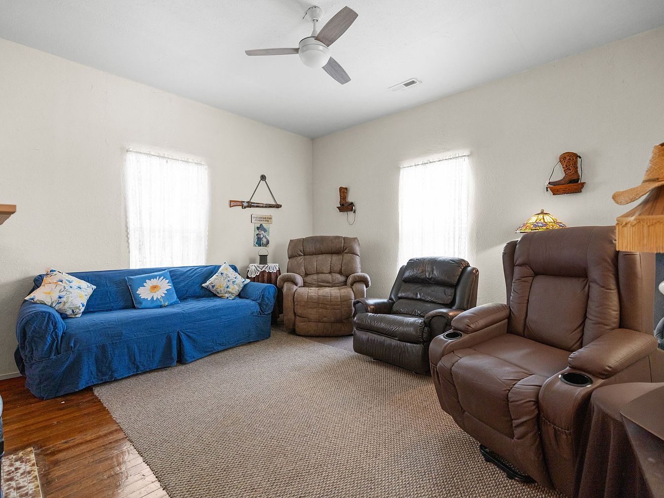 A welcoming living room styled for comfort and relaxation, featuring a mix of plush recliners and a bright blue sofa adorned with floral cushions. The space is surrounded by neutral cream walls and two large windows, allowing natural light to gently filter through lace curtains. The carpeted floor offers a soft contrast to the exposed wooden edges, creating a warm environment for family gatherings. Unique touches like rustic wall-mounted boots and western-themed decor sprinkle in personal character. The overall layout prioritizes togetherness with amply spaced seating, ideal for movie nights or leisurely family time.