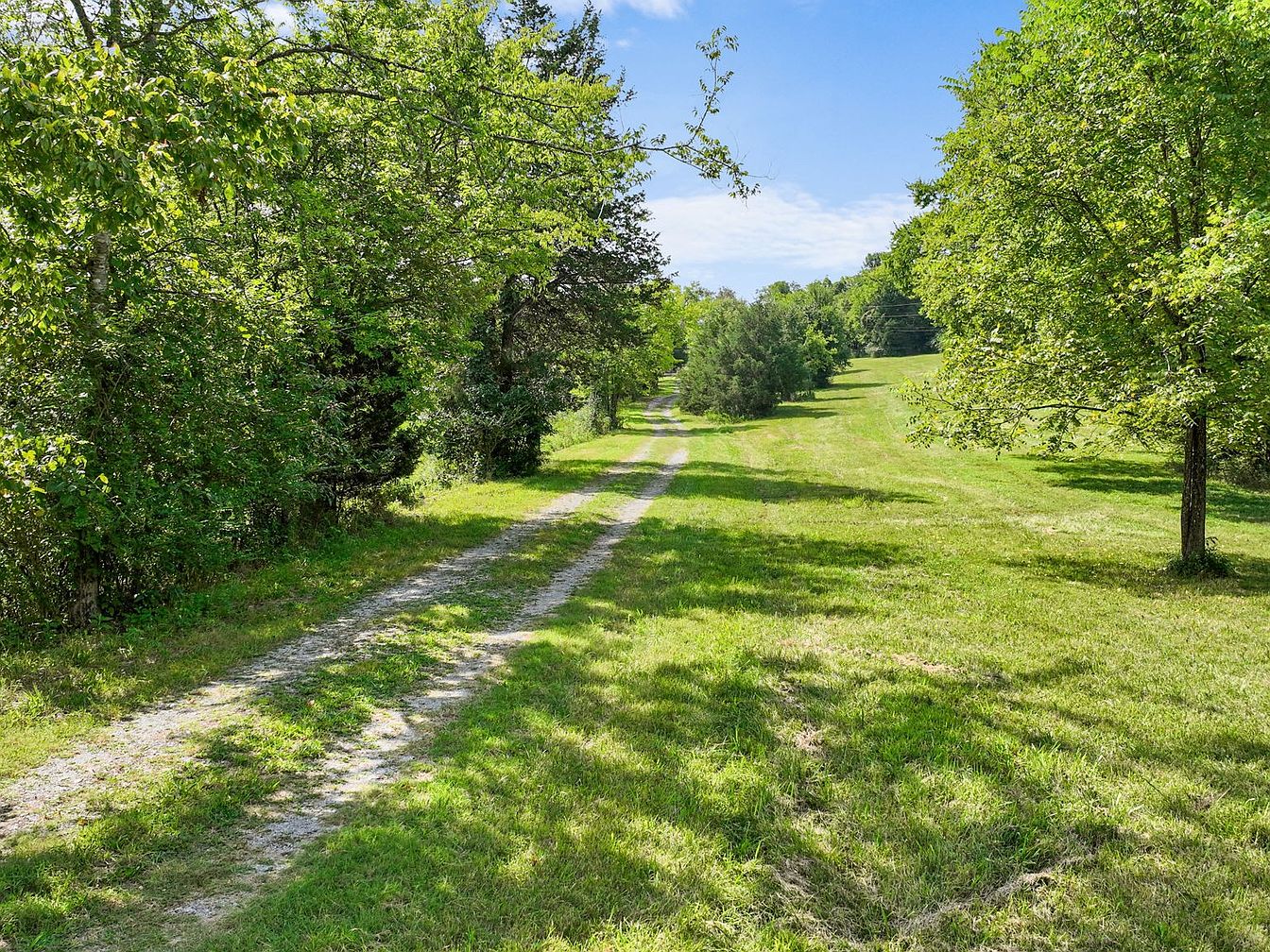 A charming gravel driveway winds through lush, open lawns and mature trees, offering a tranquil, welcoming approach to the home. The wide green spaces on either side provide plenty of room for children and pets to play freely, while the scattered shade trees keep the area cool and inviting even on sunny days. The natural landscaping and mix of open lawn and forested edges create a harmonious balance between privacy and scenic views. This driveway not only serves as a practical entrance but establishes a warm, country-inspired introduction to the property, ideal for family gatherings and outdoor activities.