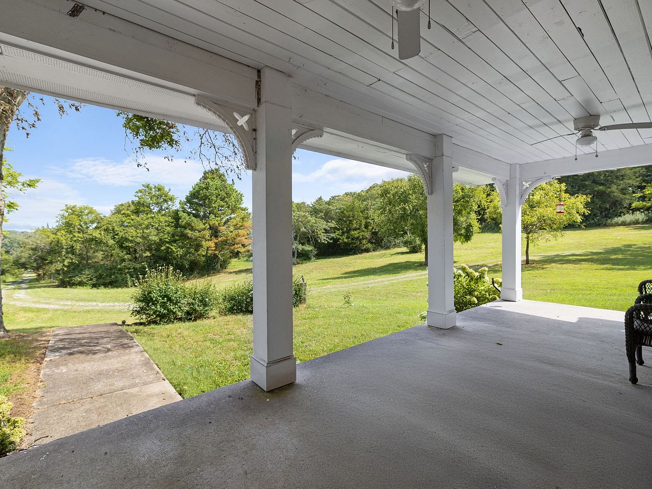 A spacious, covered front porch extends from the home, offering an inviting space to relax and enjoy scenic views of rolling green lawns and mature trees. Featuring a classic white color scheme, the porch is finished with charming decorative trim on the columns and ceiling fans for comfort during warmer months. The wide, open layout provides ample room for seating or play, making it perfect for family gatherings or quiet afternoons outdoors. Built-in shelter from the elements ensures year-round use, while the sweeping landscape encourages children to explore and families to connect with nature right outside the door.