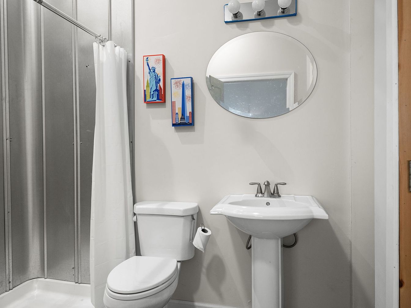A compact and functional bathroom designed with minimalist sensibilities. The vanity features a classic pedestal sink paired with a frameless oval mirror, creating an open, airy feel. The walk-in shower is sectioned off by a sleek white curtain and accented with modern metal paneling for an industrial touch. The crisp white color palette extends to the toilet and fixtures, offering a clean, fresh atmosphere. Playful wall art adds a pop of color and personality, making the space inviting for families. Practical and easy-to-clean surfaces ensure convenience, making it a great choice for busy households or guests.