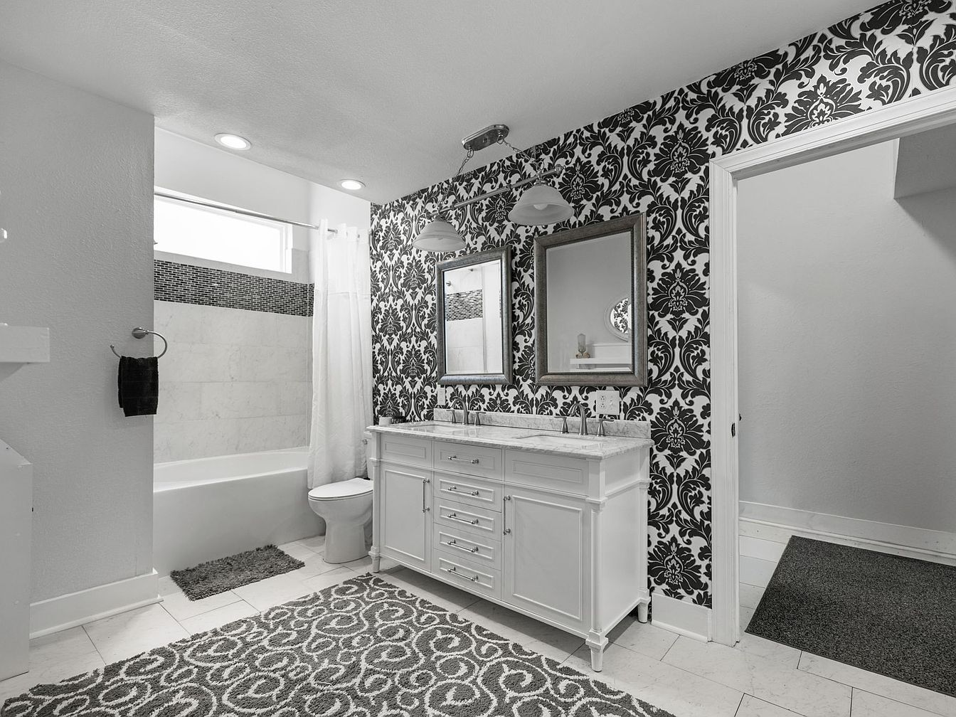 A stylish bathroom features a dual-sink white vanity with elegant marble countertops, perfect for family use. Bold black and white damask wallpaper brings drama and sophistication, complemented by matching patterned rugs for a cohesive look. The double mirrors above each sink add symmetry and function, ideal for busy mornings. Soft recessed lighting and pendant fixtures above the vanity ensure a well-lit, inviting atmosphere. The bathtub is tucked to one side with large, light tiles and a decorative tile strip, giving it a spacious and clean feel. Classic, neutral tones combined with contemporary flourishes create a welcoming, family-friendly retreat.