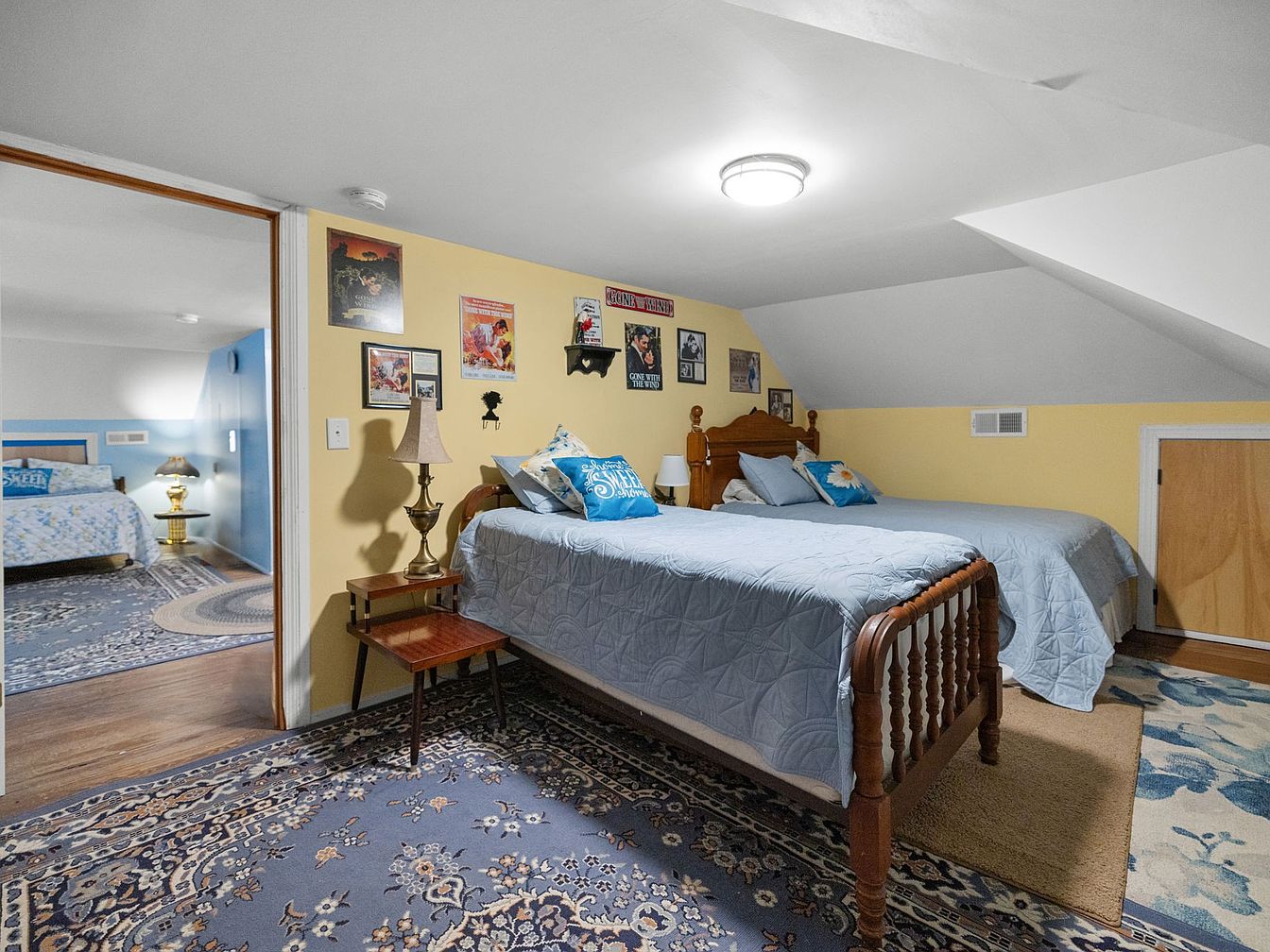 This inviting upstairs bedroom features two twin beds with classic wooden frames, draped in soft blue quilts, perfect for children or guests. Playful vintage posters and wall art lend a fun, personalized touch, making the space feel welcoming and lived-in. The sloped ceiling adds character and coziness, while the soft yellow walls brighten the room. A patterned area rug and floral throw pillows add warmth and color. An adjoining room with a queen-sized bed is visible, ideal for families needing flexible sleeping arrangements. Functional furniture, such as a bedside lamp and side tables, enhances the room’s practical, family-friendly appeal.