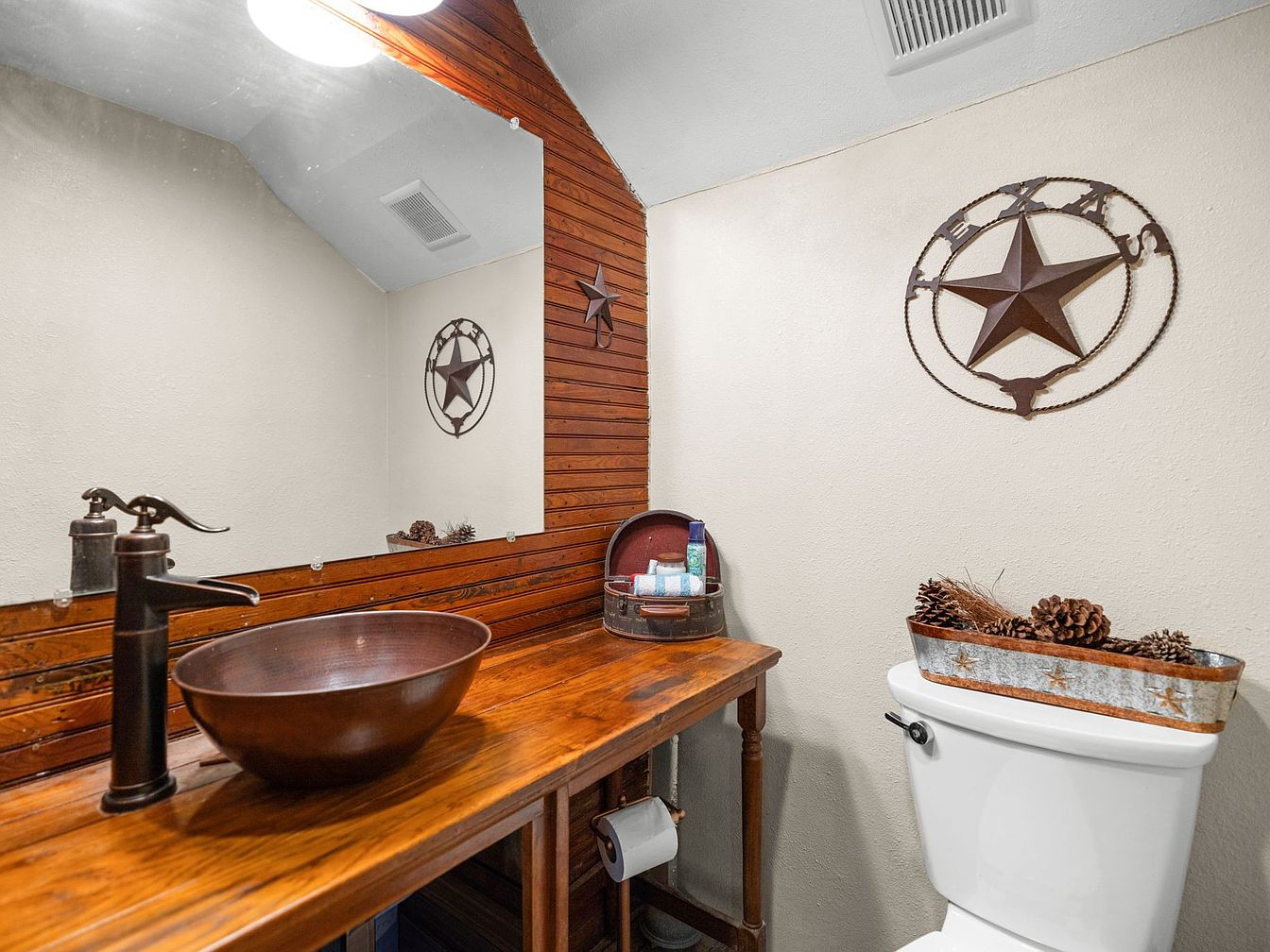 Warm wood tones, a vessel sink with a copper finish, and a sturdy bronze faucet establish a cozy, rustic aesthetic. The walls are painted a soft beige, creating a clean backdrop for the reclaimed wood accent wall. A large mirror brightens the compact space, while Texas-themed décor, including a metal star wall hanging, adds regional charm. Natural elements such as pinecones and dried botanicals in a metal tray lend a homely, nature-inspired touch. Practical storage is provided for toiletries in a decorative tin, making this stylish half-bathroom both family-friendly and welcoming for guests.