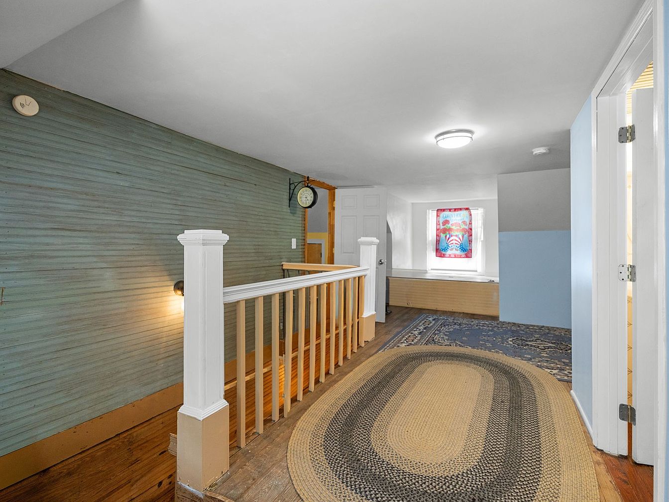This upstairs hallway features a harmonious blend of rustic charm and cozy comfort, making it a perfect transitional space for family living. The hardwood flooring, paired with an oval braided rug and deep blue area carpet, establishes a warm, inviting tone. The soft pastel blue wall paneling and white railings offer a clean, fresh feel, while the whimsical window tapestry and decorative clock inject personality. The built-in window bench seating invites quiet reading moments, providing a family-friendly spot for relaxation. Ample overhead lighting ensures the stairwell and corridor remain bright and safe, ideal for both daily routines and nighttime navigation.