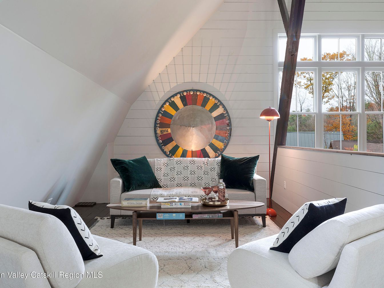 A bright, open living room featuring a modern yet playful aesthetic with sloped ceilings and abundant natural light, thanks to large windows that frame the space. The seating area is anchored by a cozy patterned sofa and two plush, curved armchairs, all in soft neutral hues. Rich emerald throw pillows add a pop of color and warmth, while a geometric rug enhances family comfort. A large, colorful wall art piece acts as a vibrant focal point. The mid-century modern coffee table and retro floor lamp bring both style and functionality, making this a welcoming spot for both adults and children.