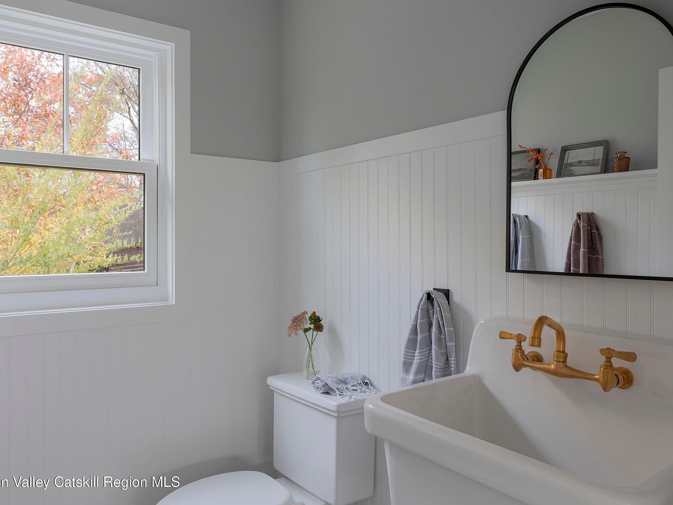 A serene, light-filled bathroom is showcased with classic beadboard walls painted bright white, pairing beautifully with soft gray above. The large window welcomes abundant natural light and views of the colorful foliage outside, creating a fresh, airy atmosphere. The vessel sink features a striking brass faucet, adding a vintage accent that stands out against the simple, clean design. Thoughtful details include neatly placed hand towels and a minimal, arched mirror for a modern touch. Shelves display small vases, family photos, and cozy decor, giving the space a warm, inviting, and family-friendly feel ideal for daily routines.