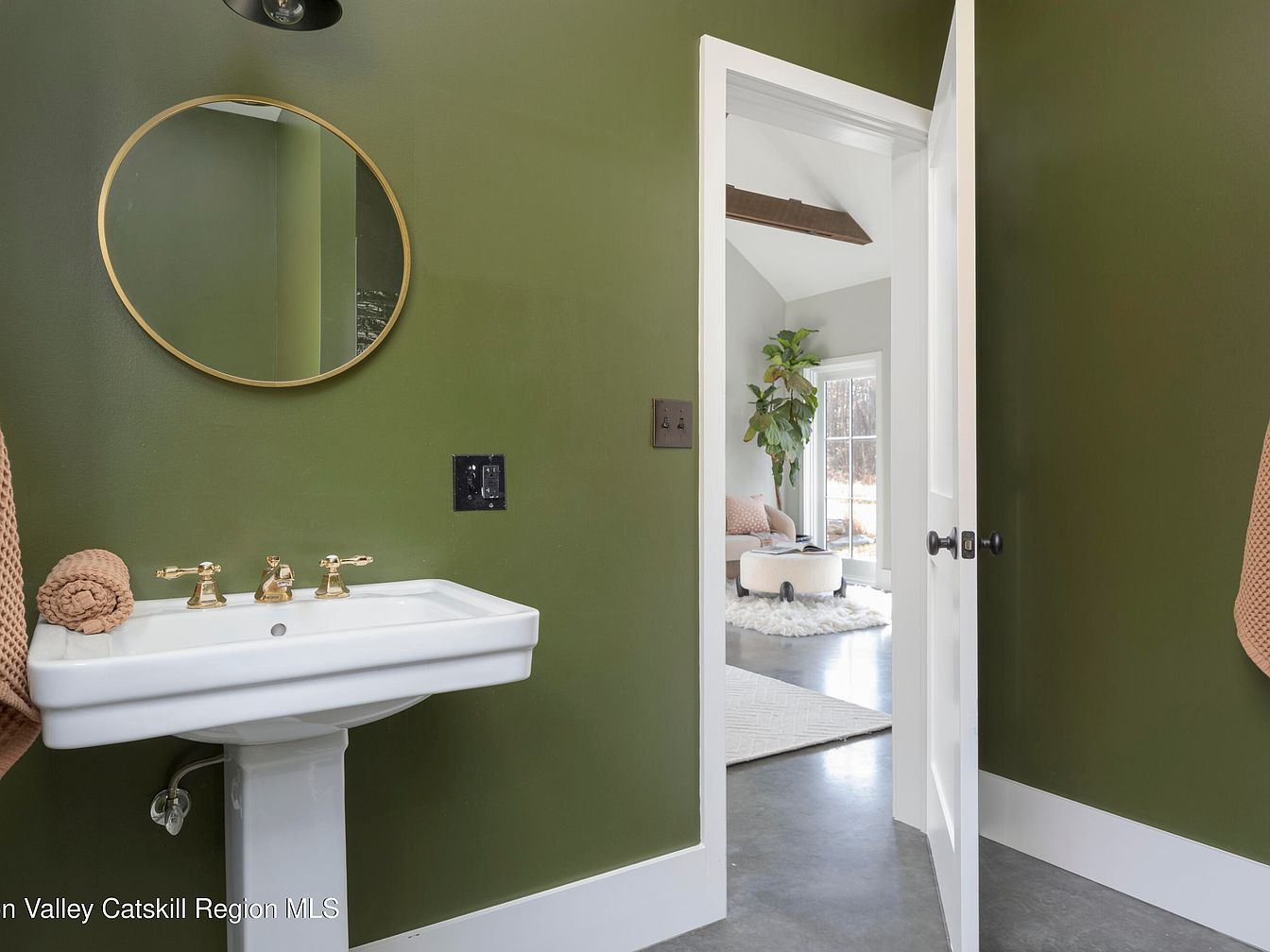A compact yet stylish bathroom showcases a white pedestal sink accented with gold fixtures and a matching round mirror framed in gold, set against rich olive green walls. Soft, textured towels in neutral earth tones enhance the warm and inviting vibe, making the space both elegant and family-friendly. The bathroom transitions seamlessly into a bright sitting area through a white-trimmed open door, revealing light grey floors, a comfy armchair, plush rug, and large windows for abundant natural light. Clean lines and uncluttered surfaces create a fresh, modern look, balanced by cozy, accessible details ideal for daily family routines.