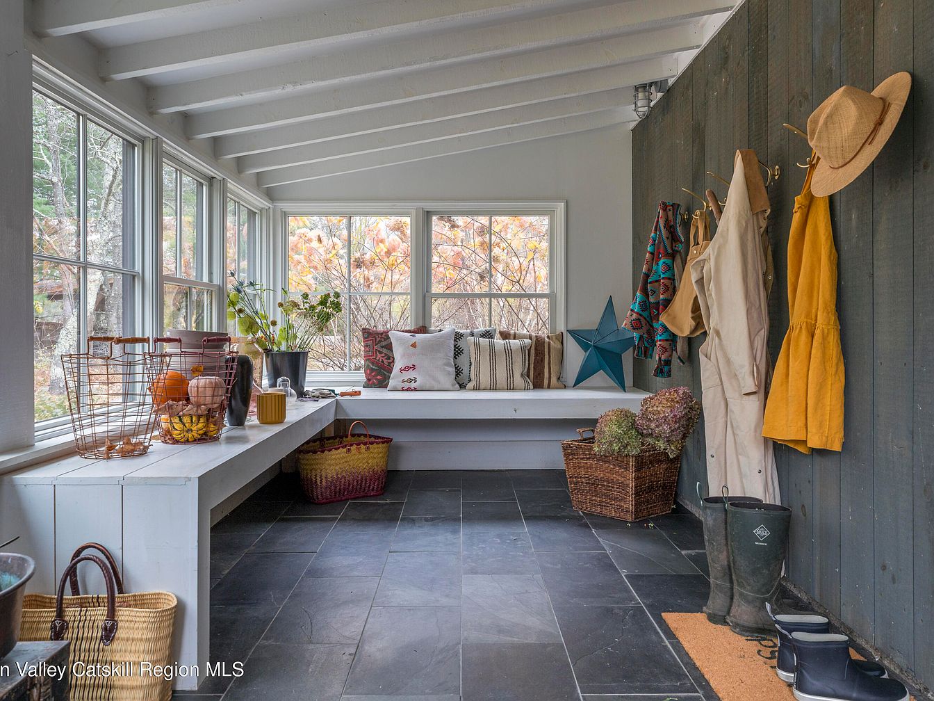 A spacious and inviting mudroom welcomes you with slate flooring and a wall of oversized windows, filling the space with natural light. The built-in bench runs along two walls, providing ample seating and storage for shoes or baskets. Hooks line the rustic wood-paneled wall, ready for jackets, hats, and bags, making this an organized and family-friendly drop zone. Earth-toned accessories, cozy patterned pillows, and woven baskets infuse warmth and personality. The crisp white ceiling beams and neutral palette create a fresh, airy feel, while practical touches like rain boots and garden gear make this mudroom highly functional for active family life.