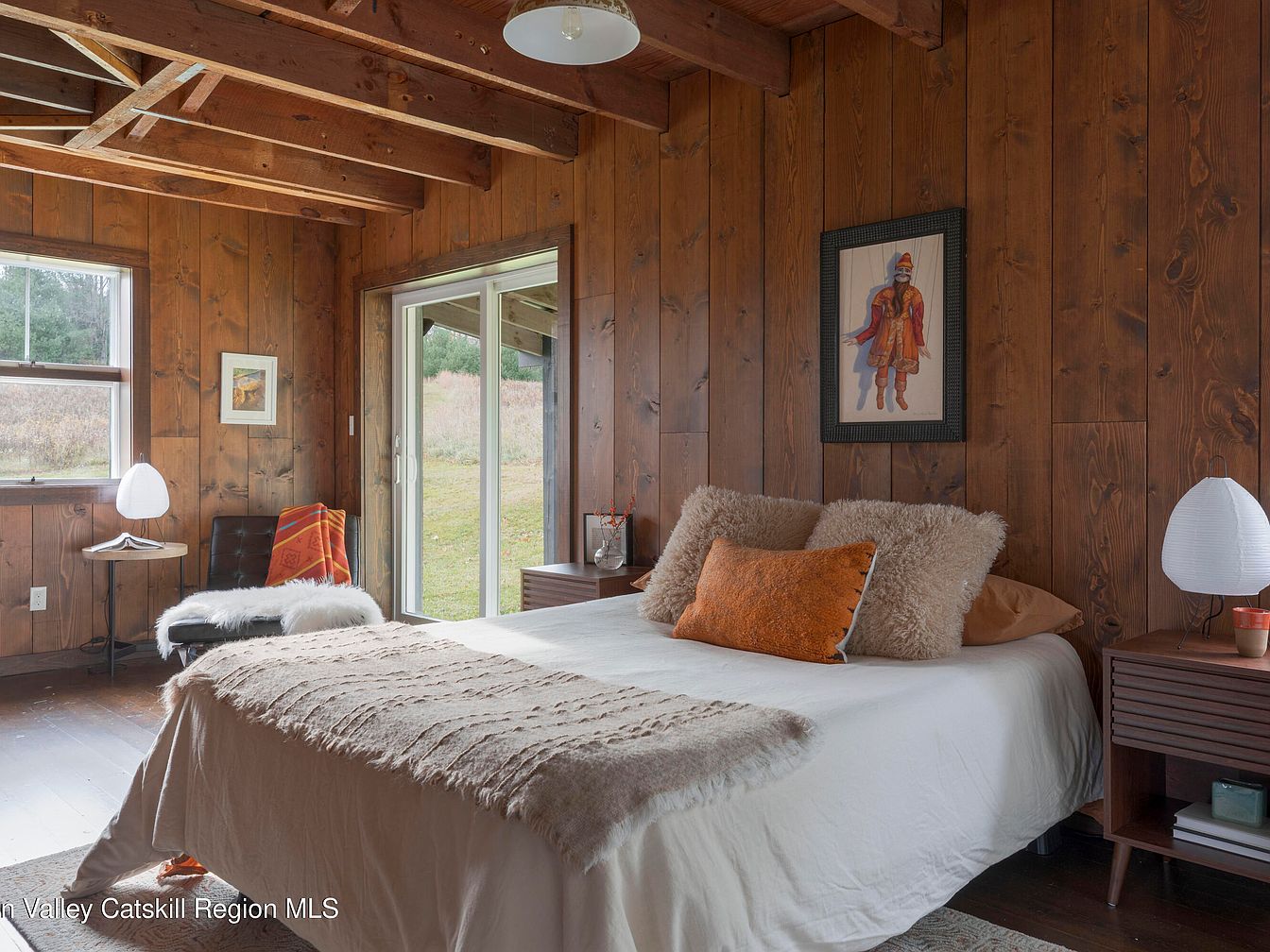 A warm, inviting bedroom features rich knotty wood walls and an exposed beam ceiling, lending a rustic cabin-like charm perfect for relaxing family getaways. Large sliding glass doors provide ample natural light and easy access to the outdoors, while a pair of modern wooden nightstands frame a plush bed dressed in soft neutrals and textured throws. A comfy black lounge chair draped with a fluffy white throw adds a reading nook by the window. Earthy tones, simple art, and minimalist lighting make the room feel both welcoming and functional, suited for peaceful evenings and family-friendly comfort.