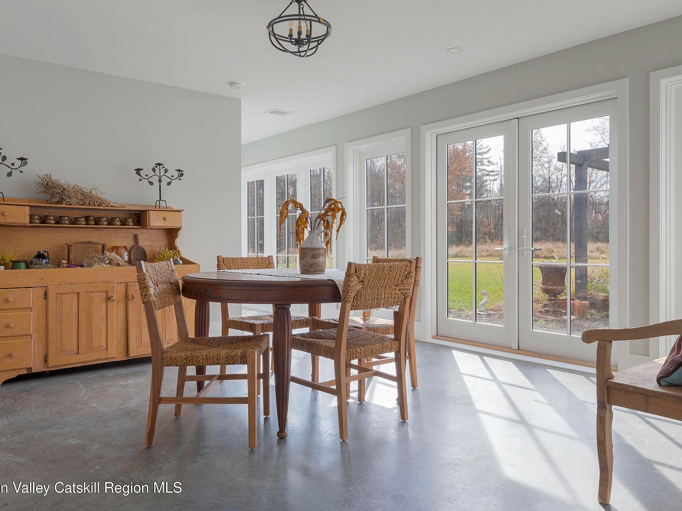 Bathed in natural light streaming through expansive French doors and tall windows, this dining nook creates an inviting atmosphere for family gatherings and everyday meals. The room features a classic wooden hutch with open shelving, ideal for storing tableware and keeping essentials within easy reach. A round table with four woven chairs encourages a cozy, communal setting for children and adults alike. Soft gray walls and concrete flooring combine with rustic, light-finished wooden furniture to evoke both modern simplicity and farmhouse warmth. The layout provides smooth transitions to the outdoors, making it perfect for family life and entertaining alike.