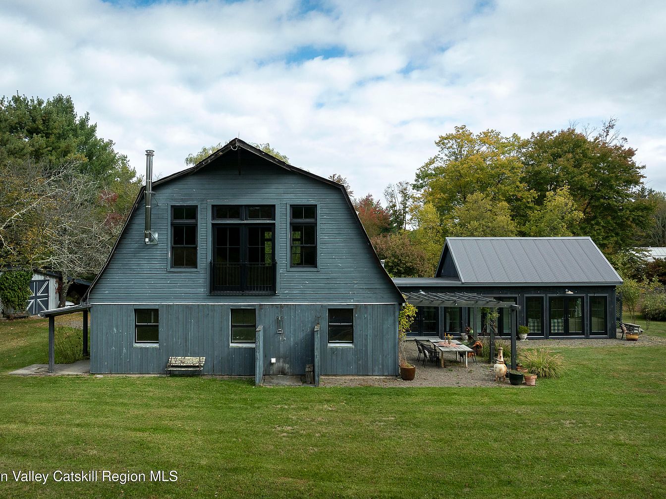A spacious backyard showcases a striking barn-style home with a modern farmhouse aesthetic, painted in a calming slate blue. Expansive windows invite natural light into both levels of the house, and a seamless extension blends rustic charm with contemporary lines. The attached glass-walled sunroom and large patio area are perfect for gatherings, featuring a pergola-covered outdoor dining set. Designed for family living, the open lawn offers plenty of space for kids to play, while surrounding trees provide privacy. Potted plants and rustic details add warmth, making this backyard an inviting retreat for all ages.