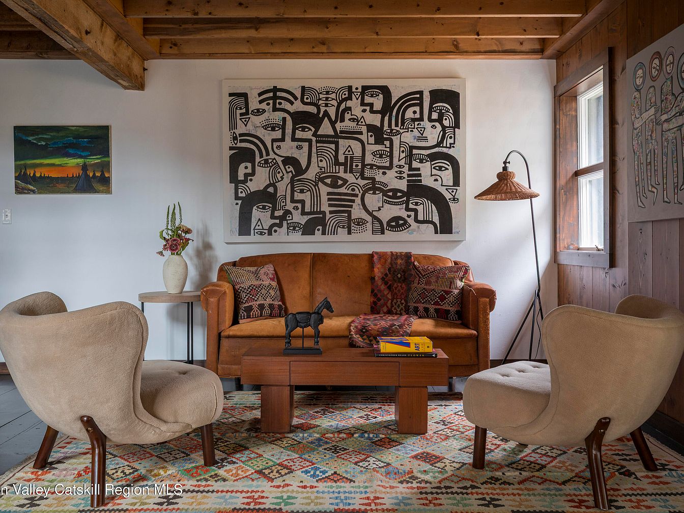 Warmth and character fill this living room, where a rustic wooden ceiling pairs seamlessly with wood-paneled walls. The cozy sitting area features a caramel leather couch, adorned with colorful patterned throw pillows that add a touch of comfort and style. Two plush, mid-century modern chairs flank a low, chic coffee table, ideal for family gatherings or board games. An eclectic patterned rug grounds the space, making it inviting for children to play. Thoughtful art choices—bold black-and-white abstract above the sofa and lively paintings on surrounding walls—inject personality and artistic flair, while natural light streams in, enhancing the room’s relaxed atmosphere.