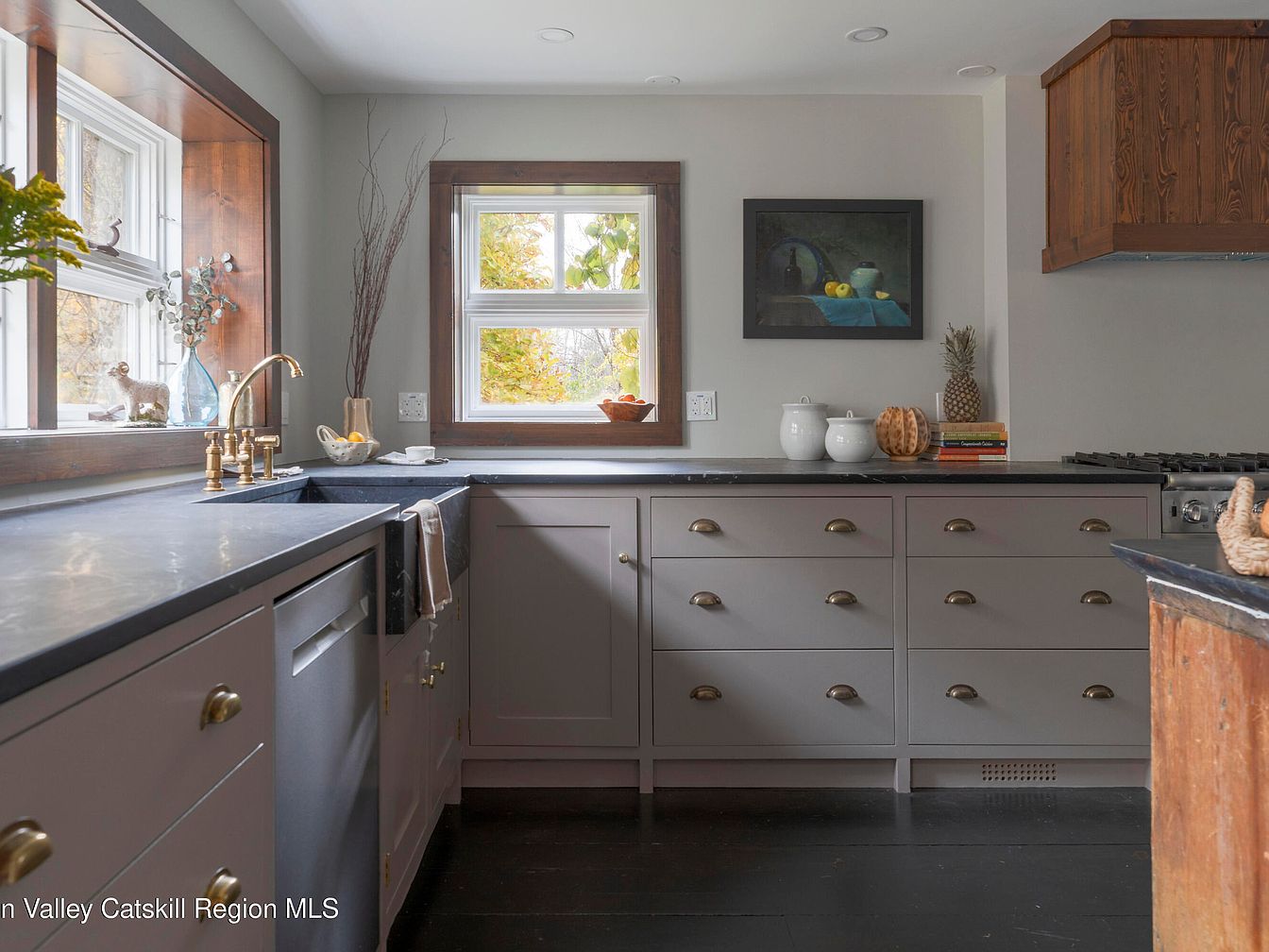 Featuring an inviting kitchen corner, this space boasts soft gray cabinetry paired with sturdy brass handles for a timeless look. The countertops are a dark stone, providing ample workspace for family cooking and crafts. Generous windows framed in rich wood offer abundant natural light and scenic views, enhancing the warm, homey atmosphere. A farmhouse-style sink with a brass faucet rests beneath the main window, complemented by carefully selected decorative accents, fresh flowers, ceramics, and artwork, adding personal charm. Sturdy lower cabinets offer plenty of storage, while an adjacent stove encourages home-cooked meals, making the kitchen both practical and family-friendly.