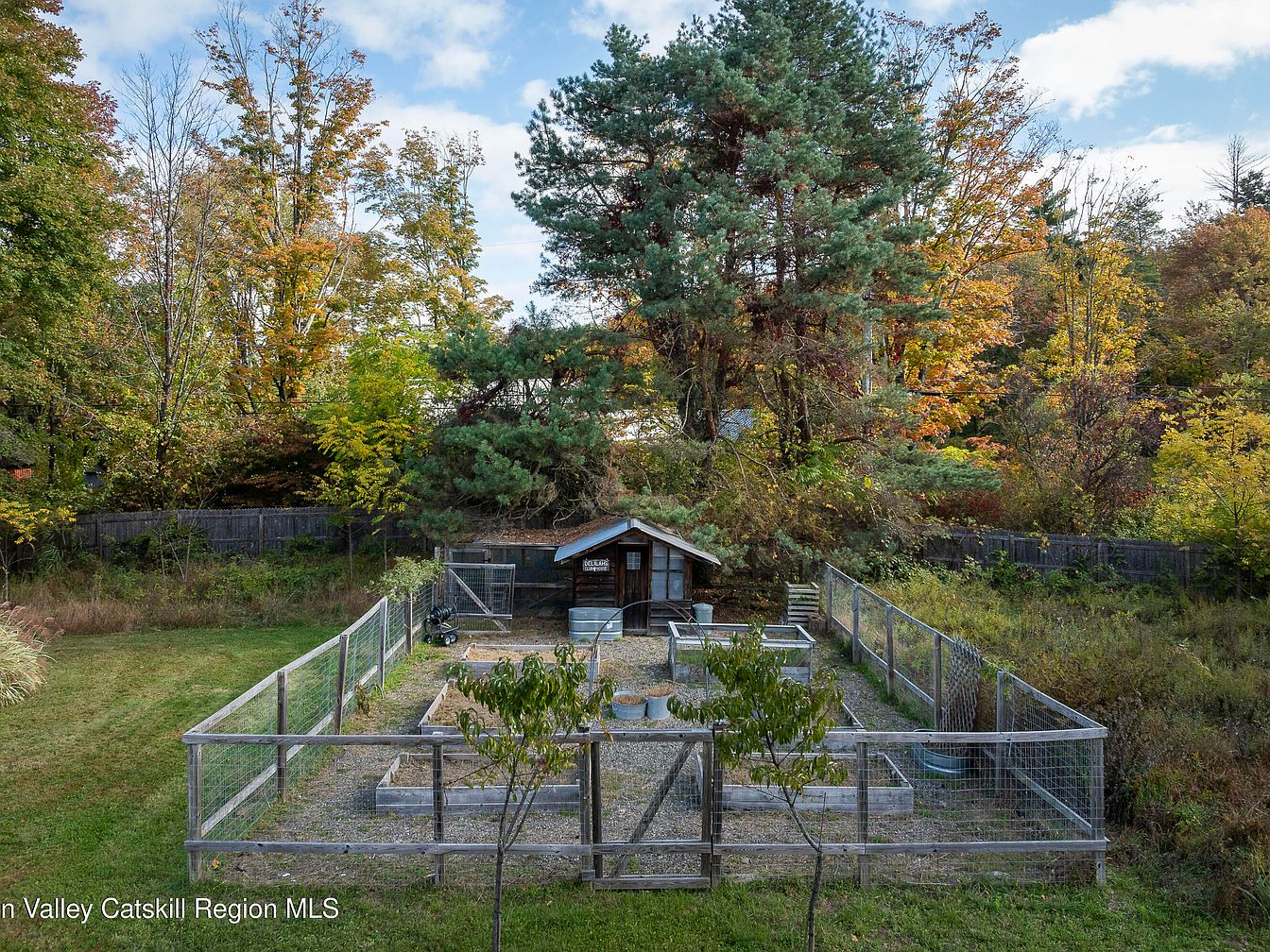 Tucked beneath colorful autumn trees, this thoughtfully designed backyard features a well-maintained chicken coop at its center, surrounded by enclosed wire fencing for safety and organization. Raised garden beds border the coop, offering plenty of space for growing vegetables or herbs, creating a blend of homesteading utility and family-friendly outdoor activity. The natural wooden fence and farm-inspired structure blend seamlessly with the lush greenery and seasonal foliage, providing a peaceful retreat for children and adults alike. The spacious layout encourages outdoor exploration, gardening, and a touch of rural living, perfect for families seeking both productivity and relaxation.