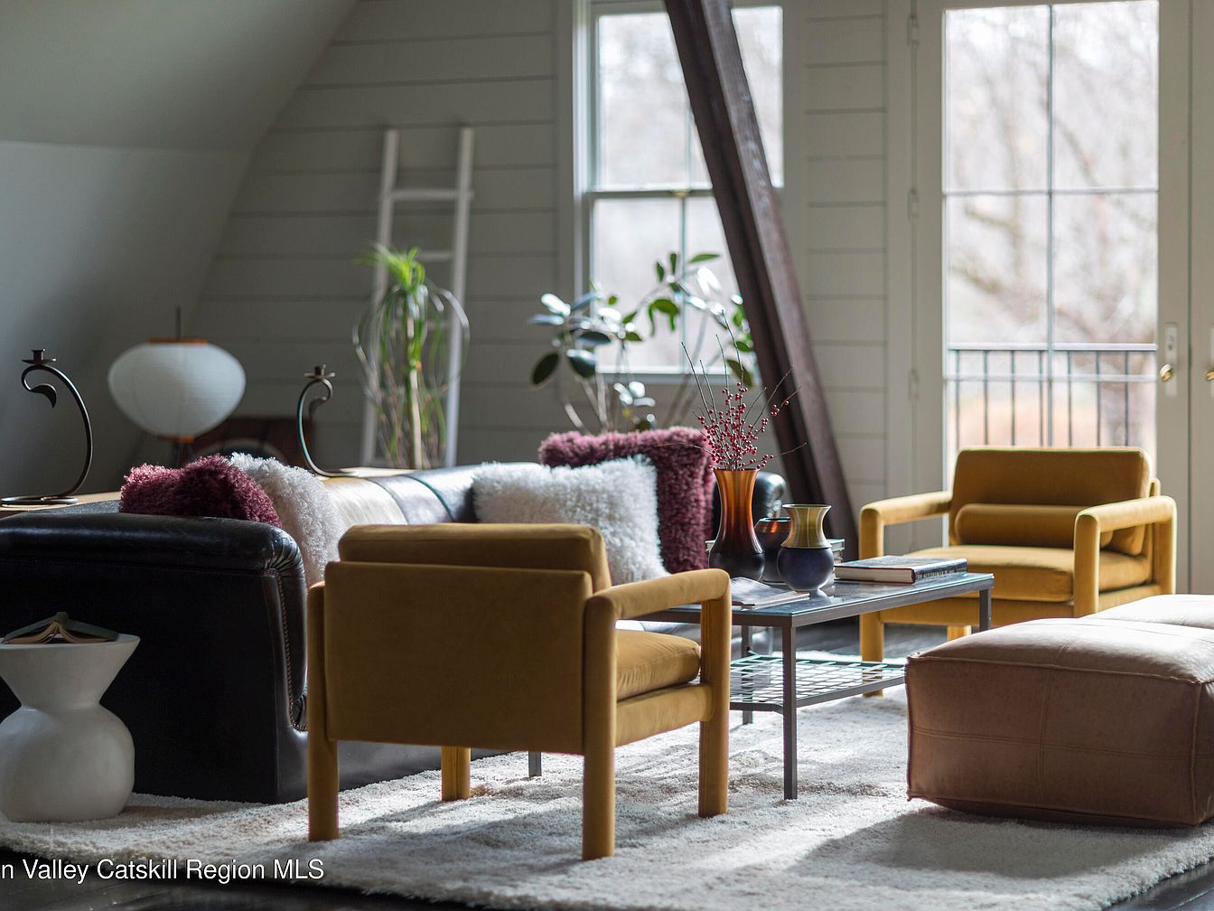 A light-filled living room blends mid-century style with modern comfort, featuring a pair of mustard yellow armchairs and a deep leather sofa adorned with fluffy throws and textured pillows. Large windows and double doors welcome natural light, while a soft, plush area rug covers the floor, making the space inviting for family gatherings or quiet afternoons. The coffee table is decorated with minimalist ceramics, books, and delicate vases, while potted plants add a lively, fresh touch. Soft, neutral wall tones and wood accents contribute to a cozy yet sophisticated atmosphere, perfect for both relaxation and entertaining family members of all ages.