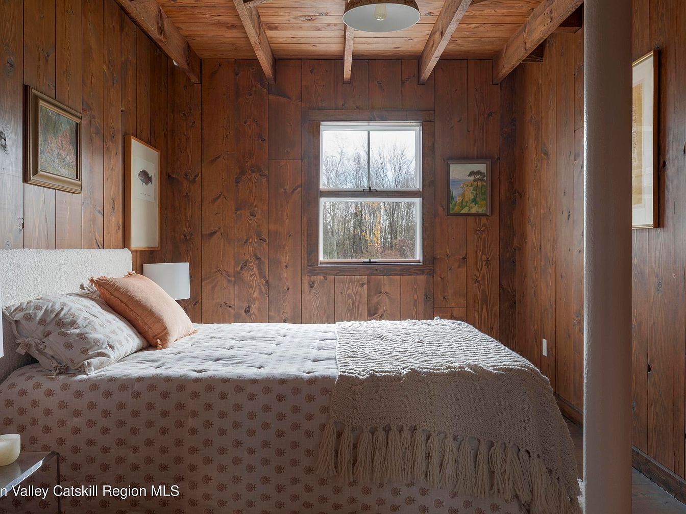 Warm wooden walls and exposed beams give this bedroom a rustic, cabin-like charm that feels both inviting and tranquil. Soft, neutral bedding with subtle patterned linens and blush-tone throw pillows creates a welcoming atmosphere ideal for relaxation. Natural light pours in from a central window, offering scenic views of the outdoors and illuminating the intimate space. Minimalist décor, including framed art and a small bedside lamp, adds personality while maintaining an uncluttered look, perfect for families seeking both comfort and simplicity. The overall design is timeless, functional, and effortlessly cozy, making it an appealing haven for all ages.