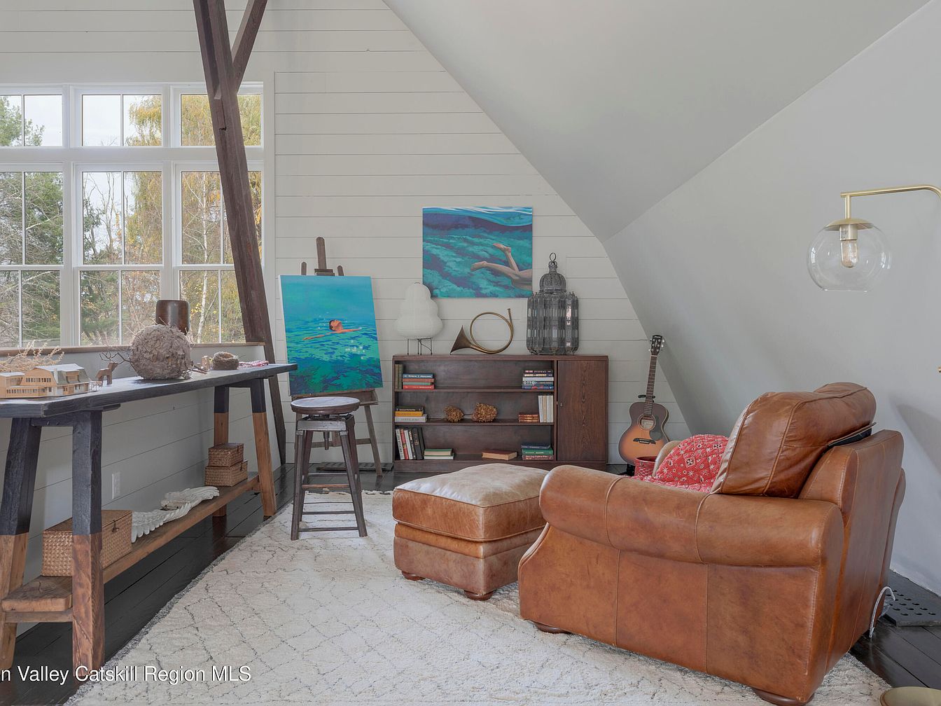 Bright natural light streams through large grid-style windows, illuminating a cozy and inspiring artist’s nook. The sloped ceiling and shiplap walls create an inviting, airy atmosphere, ideal for creativity and relaxation. A caramel leather armchair with matching ottoman offers a comfortable seating area on a soft, patterned rug, making this a perfect family-friendly spot for art projects or quiet reading time. The workspace includes a sturdy wooden table with models and art supplies, complemented by an easel displaying vibrant paintings. An acoustic guitar in the corner suggests musical inspiration, and open shelving provides both display and storage for books and personal treasures.