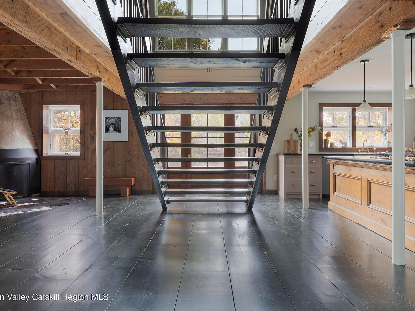 A central open staircase provides a stunning architectural focal point, perfectly connecting the home’s spacious living and kitchen areas. Black wood treads and iron railings offer a modern, industrial contrast to the natural warmth of exposed timber beams and wide plank floors. Soft, neutral walls complement the rustic wooden textures and refined cabinetry in the kitchen, all bathed in natural light from generous windows. The spacious layout allows for easy movement, making it ideal for family life, with wide walkways and sightlines allowing parents to keep an eye on children. Subtle decor, cozy seating, and a nearby hearth promote both comfort and togetherness.