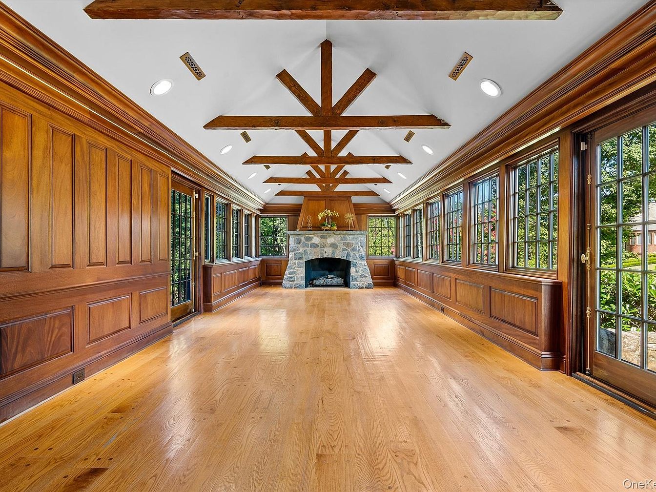 This spacious family room showcases an elegant fusion of traditional and modern aesthetics, featuring rich wood paneling and exposed beam ceilings that create warmth. The large stone fireplace acts as a stunning centerpiece, perfect for cozy gatherings. Ample windows invite natural light, enhancing the room’s openness while allowing views of the lush outdoor space. The polished hardwood floors add sophistication, making the space inviting and comfortable. Carefully designed with family-oriented features, this room is ideal for entertaining or relaxing, embodying a harmonious blend of style and functionality perfect for all ages.