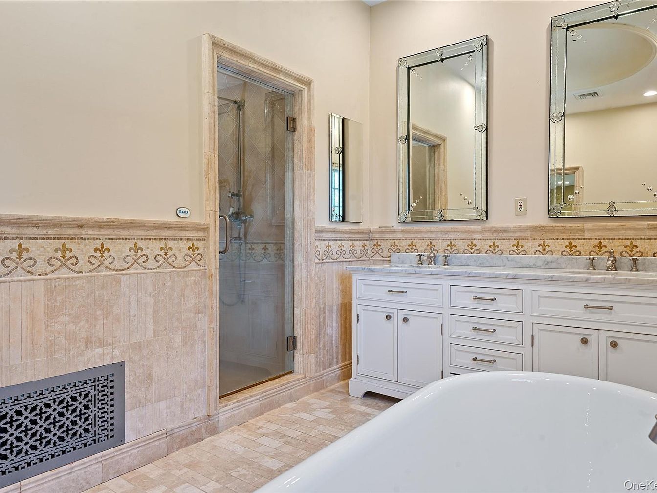 This spacious bathroom boasts a seamless blend of elegance and functionality, designed to provide a luxurious experience. The light-toned marble tiles create an airy atmosphere, complemented by a decorative border featuring intricate golden accents. A stunning double vanity with polished chrome fixtures offers ample storage, while large mirrors enhance the sense of space and brightness. The glass-enclosed shower adds a contemporary touch, showcasing beautifully patterned tiles inside. Family-friendly elements include a separate soaking tub, perfect for relaxation, and thoughtful heating vents ensuring comfort in every season. Overall, this bathroom combines timeless elegance with modern amenities.