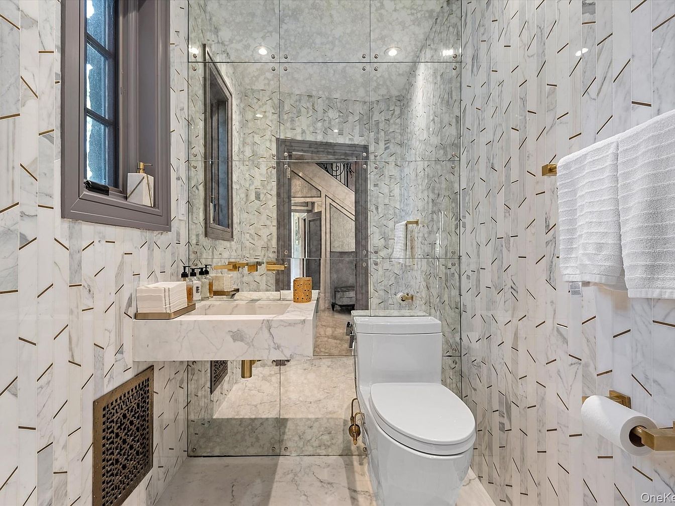 A stunning bathroom embraces luxury and modern aesthetics with its seamless blend of marble and gold accents. The walls feature beautifully patterned marble tiles, interspersed with gold strips that add a touch of glamour. A sleek, wall-mounted sink provides a clean look, complemented by minimalist black fixtures. The large, mirrored wall enhances the sense of space and light, reflecting the room’s stylish design. Ample storage solutions ensure a clutter-free environment, while the elegant window brings in natural light. Soft, plush towels neatly arranged add a cozy feel, making this bathroom perfect for family and guests alike.