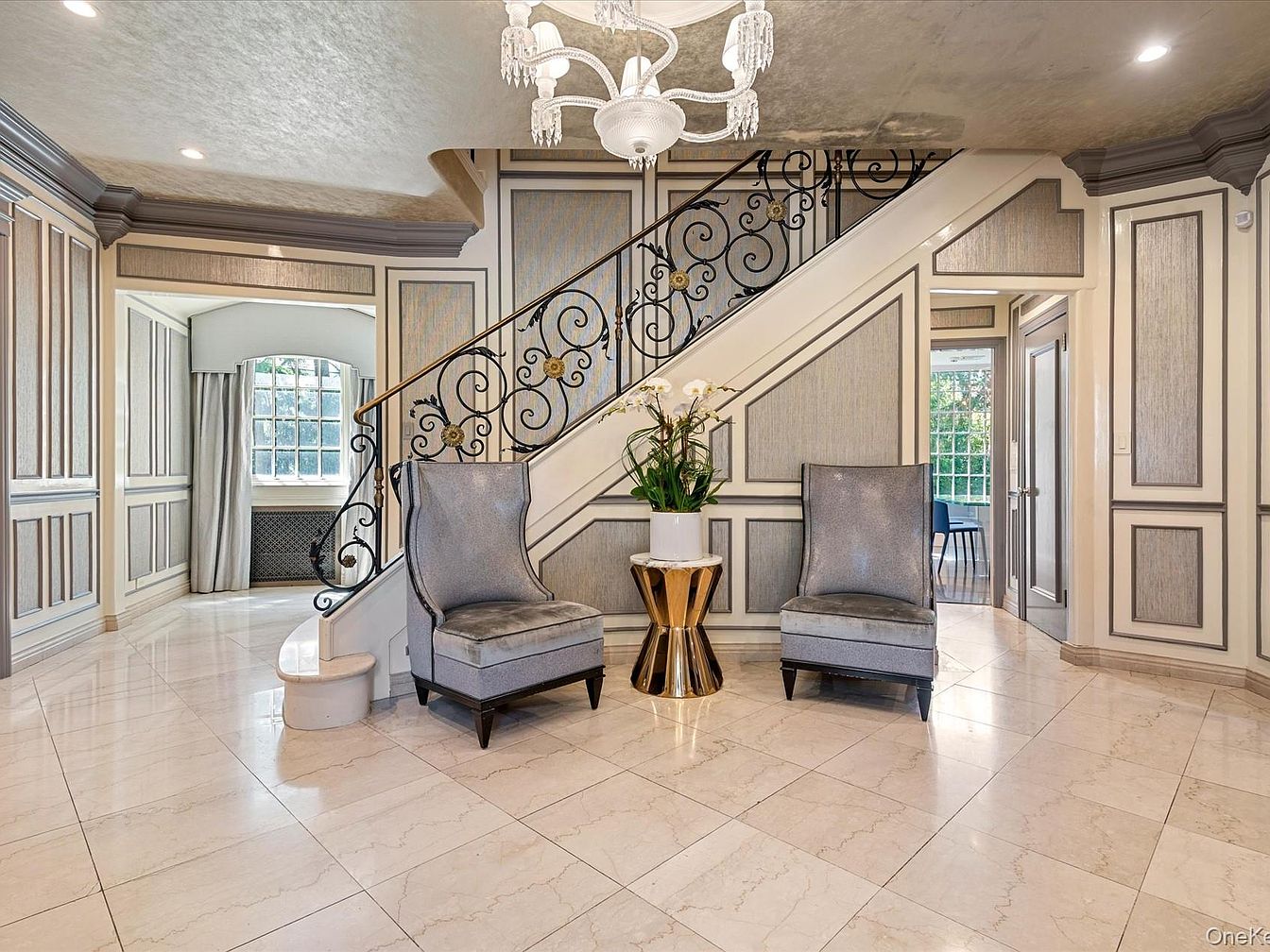 This grand entryway features a sweeping staircase adorned with intricate wrought ironwork, creating an inviting focal point. Soft, neutral hues of cream and beige blend seamlessly throughout the space, enhanced by the luxurious marble flooring. Each wall showcases elegant paneling with subtle textures, adding depth to the sophisticated design. A pair of plush armchairs in shimmering silver flanks a stylish side table, perfect for welcoming guests. Natural light floods in through the large window, illuminating the exquisite details and bringing warmth to the home. Ideal for family gatherings, this space balances elegance with comfort.
