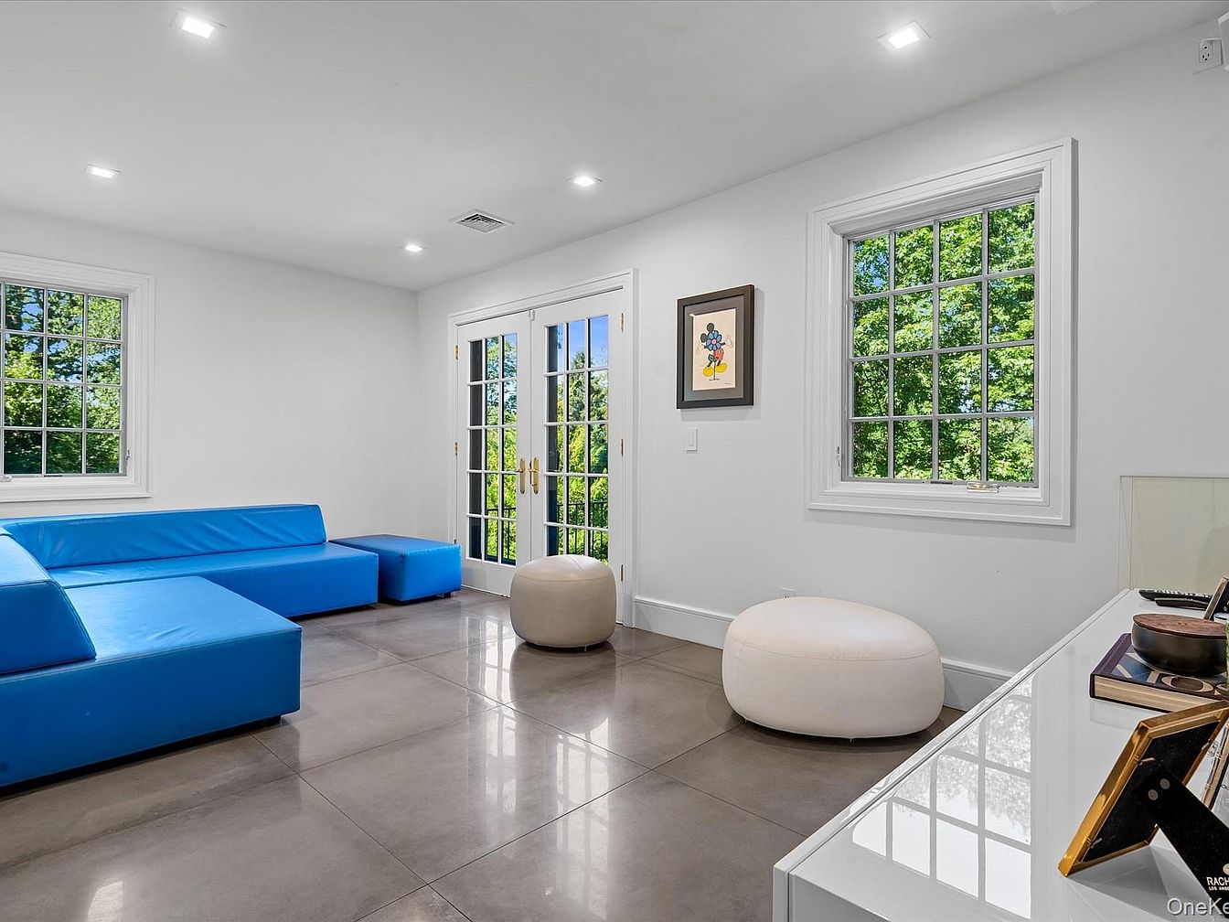 This modern living space features a sleek, open layout with a prominent blue sectional sofa that invites relaxation and social interaction. The polished concrete floors reflect natural light, enhancing the room’s airy feel, while the white walls create a fresh backdrop showcasing a vibrant piece of artwork. Large French doors lead to an outdoor view, bringing the beauty of nature inside. A plush, round ottoman adds a soft touch, ideal for families with young children. Ample natural light pours through the oversized windows, creating a warm and inviting environment perfect for gathering and entertaining.