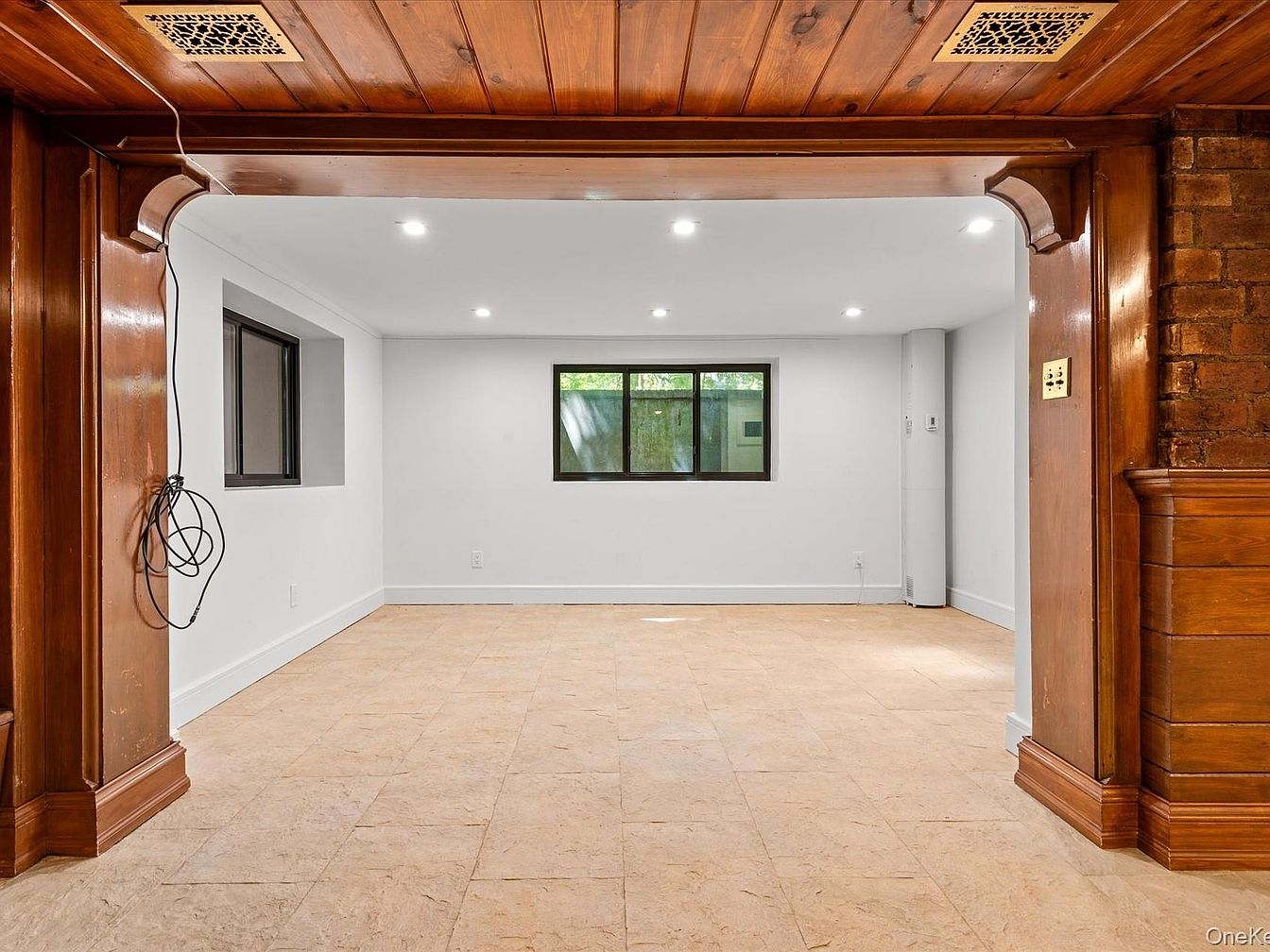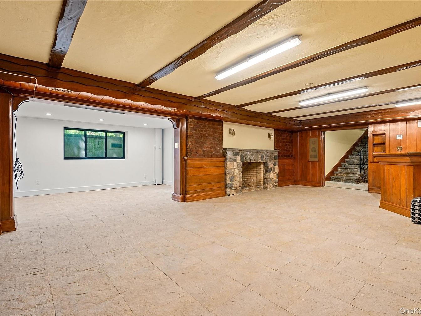 This spacious basement lounge combines rustic charm with modern functionality. Exposed wooden beams create warmth against the sleek, cream-colored ceiling, while the rich wood paneling and exposed brick fireplace add character. The layout allows for flexible furniture arrangements—perfect for family gatherings or quiet evenings. Natural light floods the space through a large window, enhancing the inviting ambiance. The stone fireplace serves as a cozy focal point, ideal for chilly nights. Neutral tile flooring extends throughout, making the area low maintenance and welcoming for playful children or entertaining guests. A thoughtfully designed nook offers additional utility.