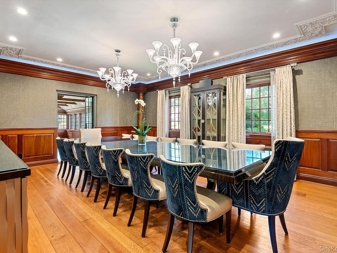 This elegant formal dining room blends sophistication and comfort, featuring a stunning glass-top table surrounded by plush, patterned chairs that enhance its luxurious ambiance. Rich wooden flooring complements the intricate wood paneling on the lower walls, while the textured gray wallpaper adds depth. Graceful chandeliers provide warm lighting, accented by natural light streaming through large windows framed with flowing drapes. An ornate china cabinet displays fine dinnerware, creating an inviting space perfect for family gatherings or formal events. The thoughtful design merges aesthetics with functionality, making it an ideal centerpiece for modern living.