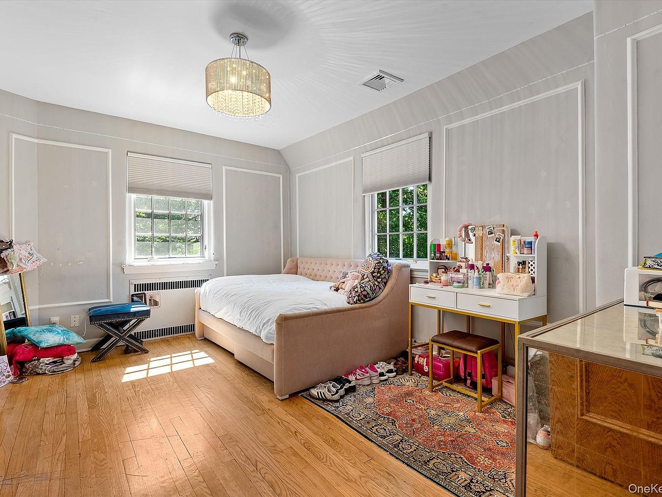 This charming kid’s bedroom showcases a blend of playful elegance and comfort. The light gray walls with crisp white trim and decorative moldings create a fresh ambiance, highlighted by a stunning chandelier that adds a touch of glamour. A plush, beige upholstered bed serves as the focal point, inviting relaxation. Natural light floods through large windows, enhancing the warmth of the wooden floors. A stylish vanity with vibrant organizers reflects the personality of its occupant, while a decorative area rug adds warmth beneath. The cozy space combines functionality with aesthetic appeal, perfect for a young dreamer.