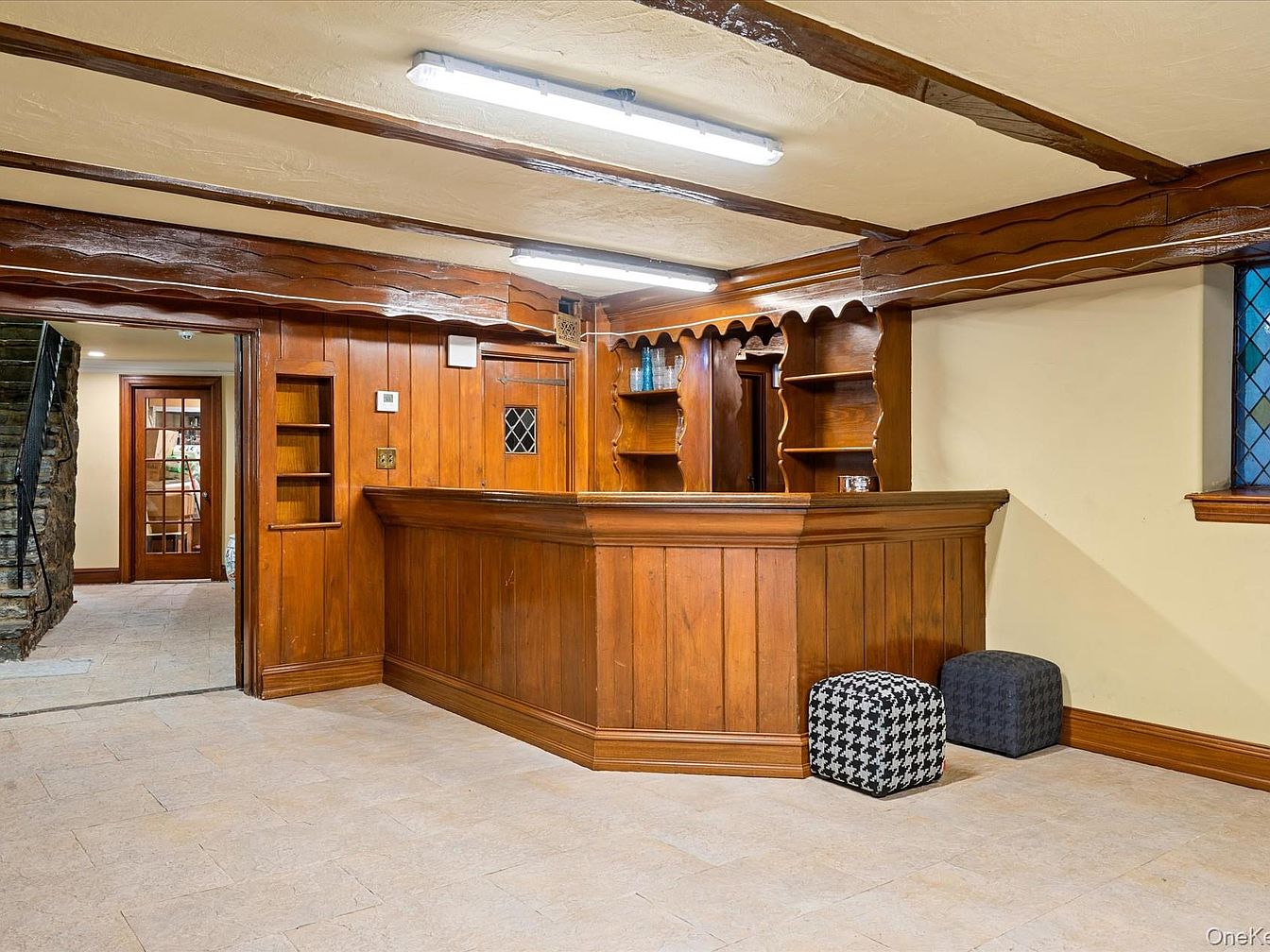 The inviting basement bar features rich wooden paneling that creates a warm and welcoming atmosphere. A finely crafted bar with detailed woodwork serves as the centerpiece, ideal for family gatherings and entertaining friends. Light-colored tiles beneath offer a spacious feel, complementing the darker woods. Adjacent shelves provide functional storage for glassware and decor. Cozy poufs in a stylish houndstooth pattern add a playful contrast in both texture and color. Natural light pours in from strategically placed windows, enhancing the feeling of openness while ensuring the space feels connected to the home’s overall charm.